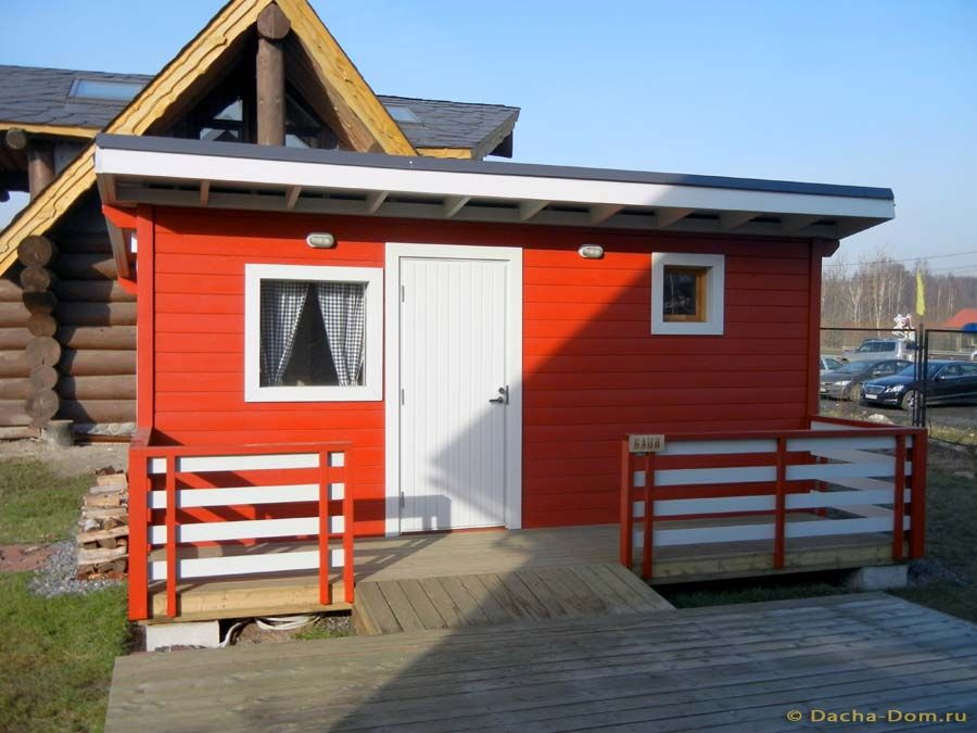 O banheiro é colocado na sala de aquecimento ou separadamente. Você pode usar o armário seco ou organizar um banheiro completo na presença de esgoto.