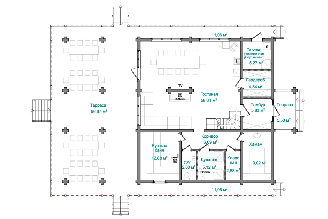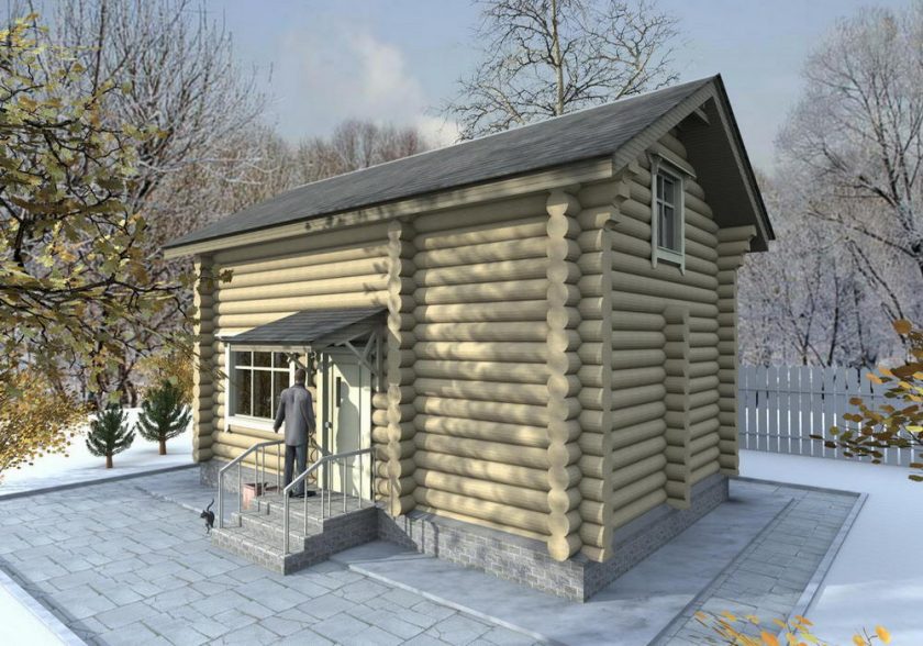 O edifício de madeira perfilada, em planta, é de tamanho suficiente para acomodar a lavagem, sala de vapor, sala de aquecimento, vestíbulo, terraço coberto e sala de recreação. Dele uma escada leva ao sótão. O espaço do sótão é isolado, está previsto um quarto ou uma sala de bilhar.