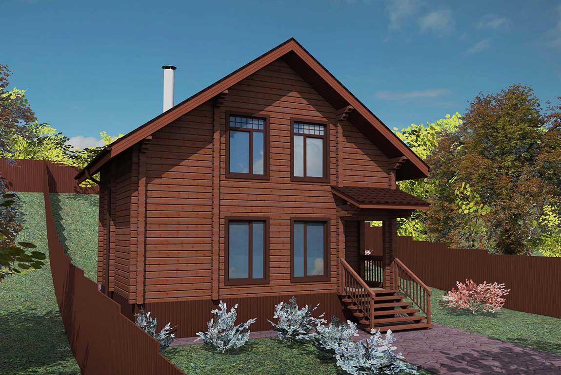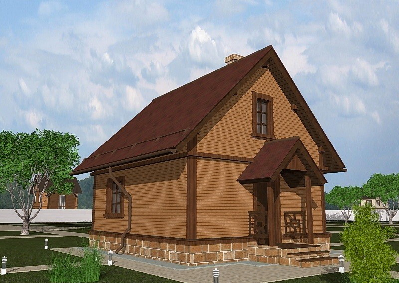 Na fachada da janela de forma trapezoidal complexa, enfatizando a inclinação do telhado. No terraço são passos decorados com pedra. Placa de vedação, repetindo a textura e a cor da barra perfilada. Para apoiar o telhado, há uma coluna de madeira decorada com ornamentos esculpidos. A lenha é armazenada sob um galpão ao lado da sala da caldeira, a partir dela leva uma entrada separada.