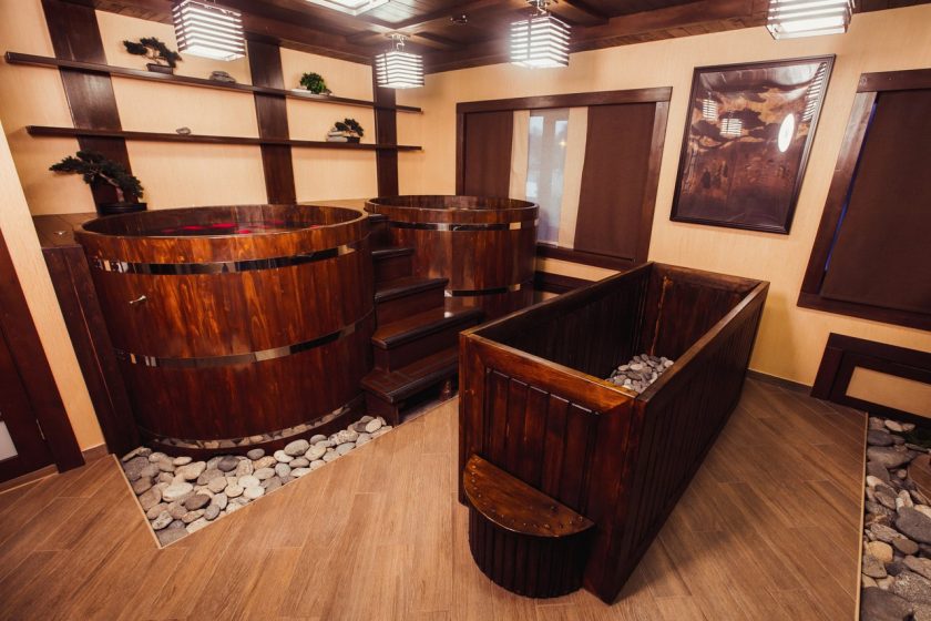 - Banho japonês - uma fonte em forma de barril cheia de água aquecida a 45 ° C com a adição de óleos essenciais, sais, extratos de ervas. A pessoa senta no banco por 15 minutos, seguida de massagem e aquecimento em um recipiente com uma mistura de cedro quente e serragem de seixo. A popularidade de tais salas de vapor está crescendo.