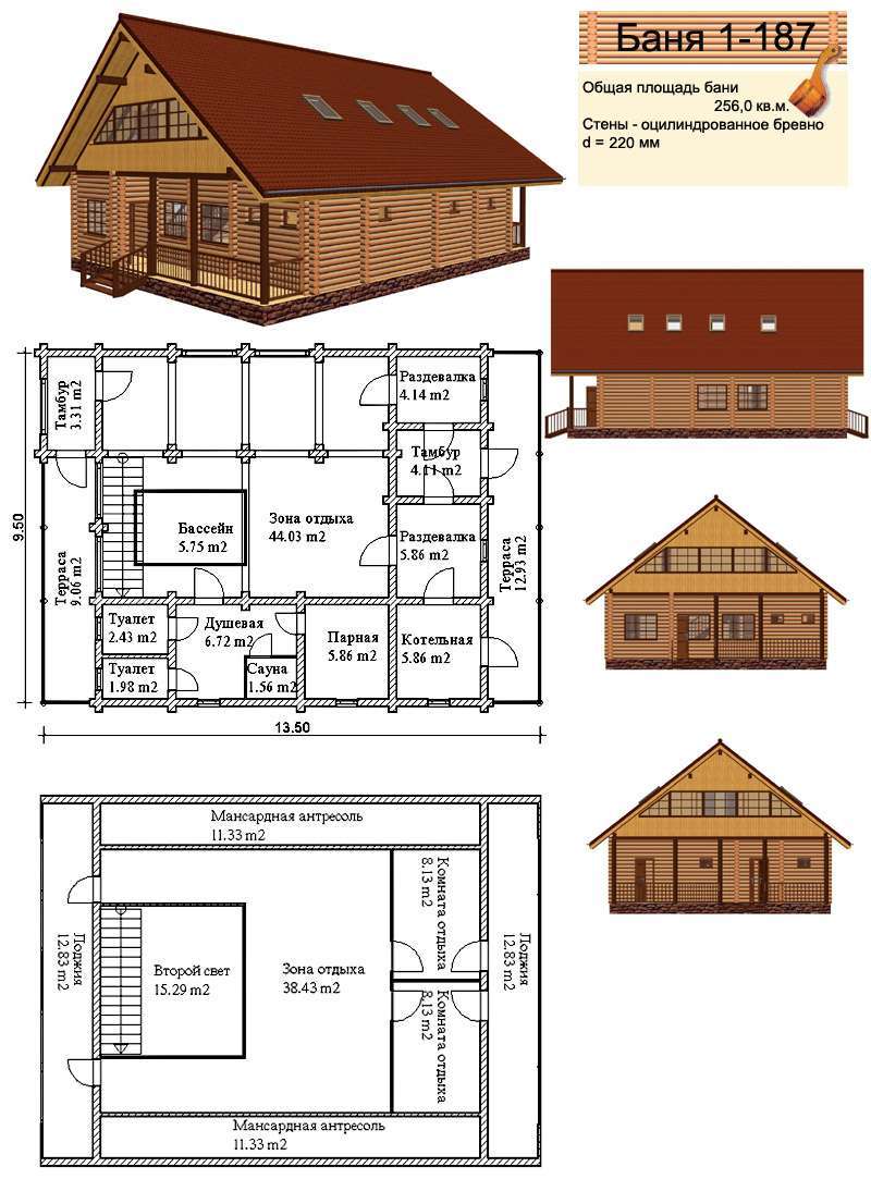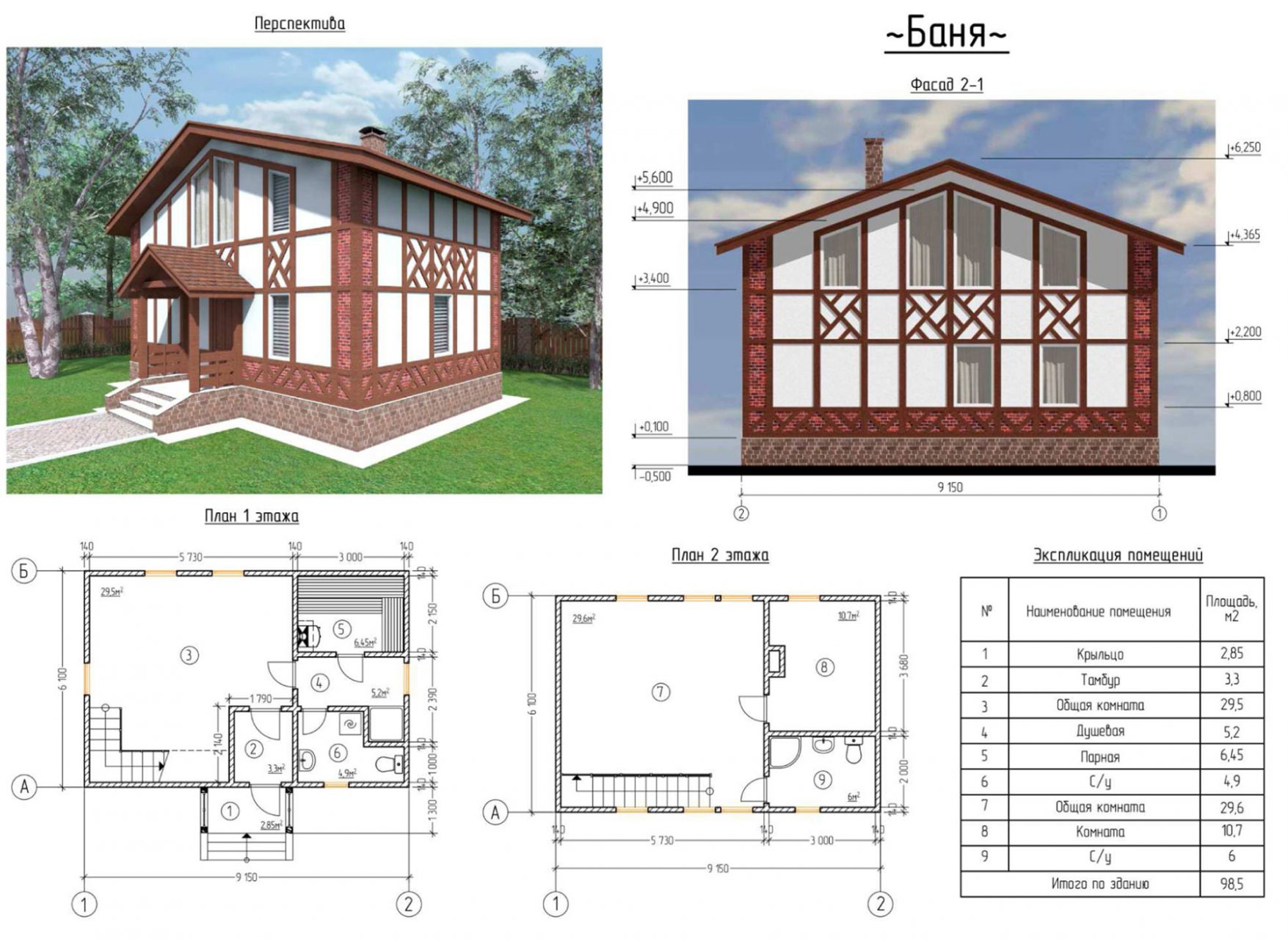 A parte arquitetônica do projeto de banho fornece uma representação visual das fachadas do edifício, do zoneamento e da composição do interior. Você pode escolher um prédio compacto para férias em família ou uma instalação de grande escala para lazer em uma grande empresa.