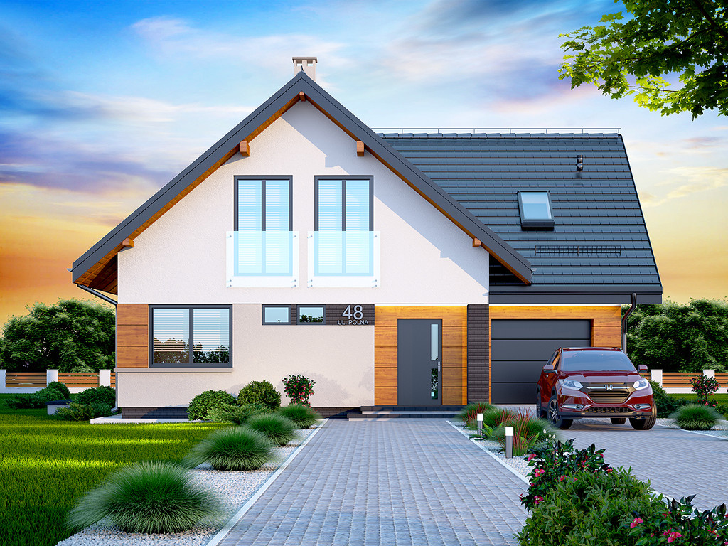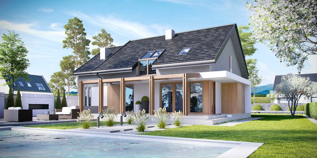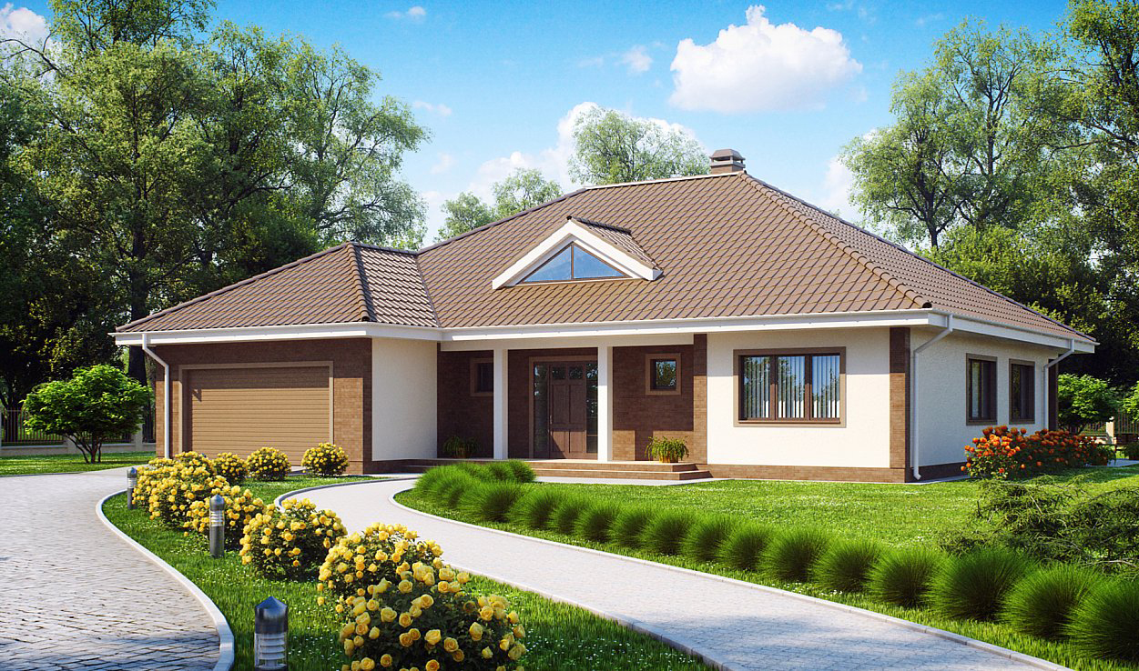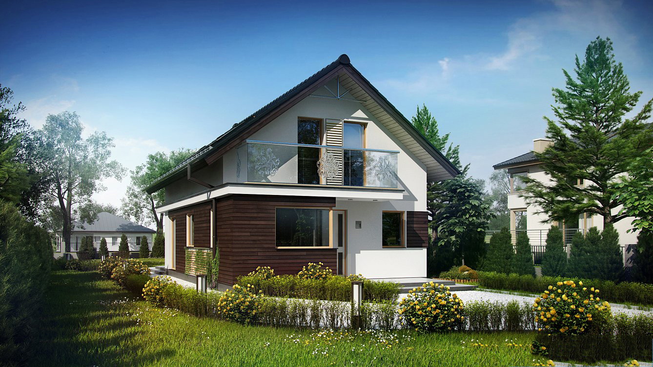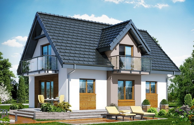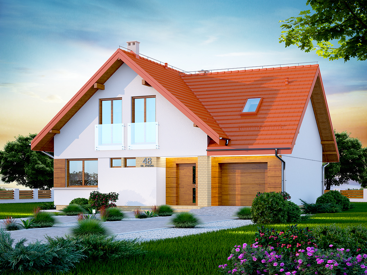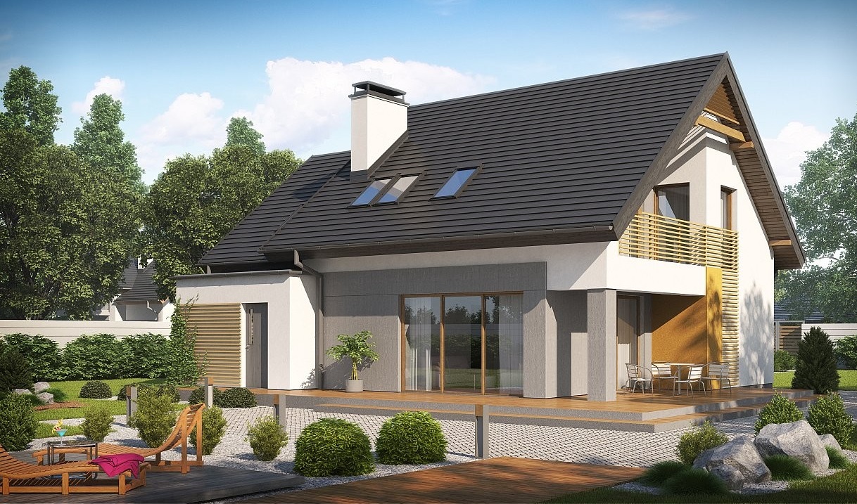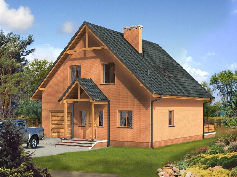 Olhando para o projeto de tal casa, você não entende imediatamente, esta é uma casa de dois ou um andar. Indiscutível plus do sótão - redução de custos em comparação com a construção de dois andares e um bônus na forma de espaço adicional utilizável para um edifício de um único andar.