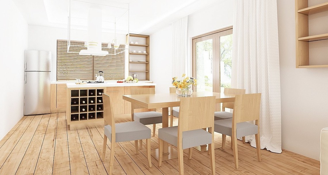 A cozinha é muitas vezes combinada com a sala de estar. A separação visual ocorre através da instalação balcão de bare O capô com este layout deve ser poderoso. Cheiros - talvez o único menos de tal zoneamento.