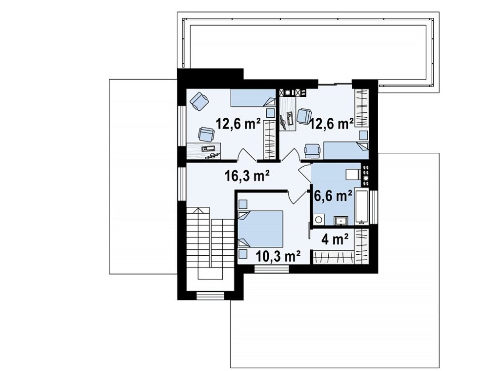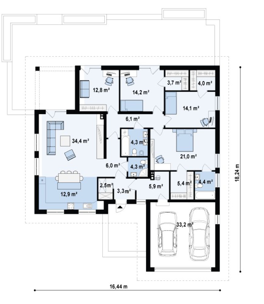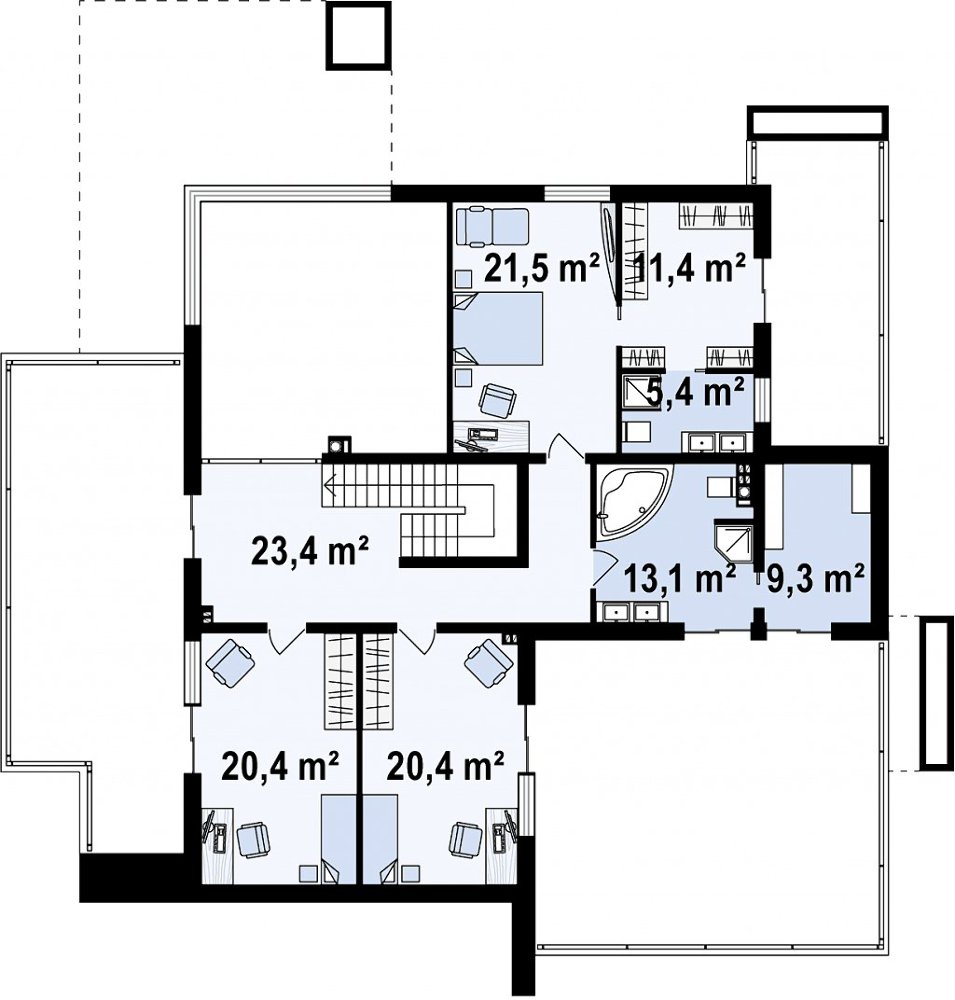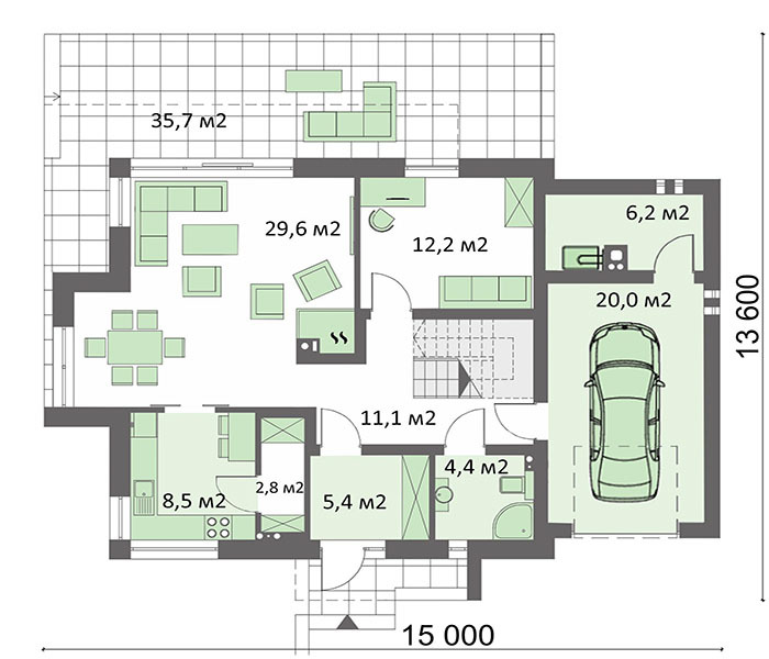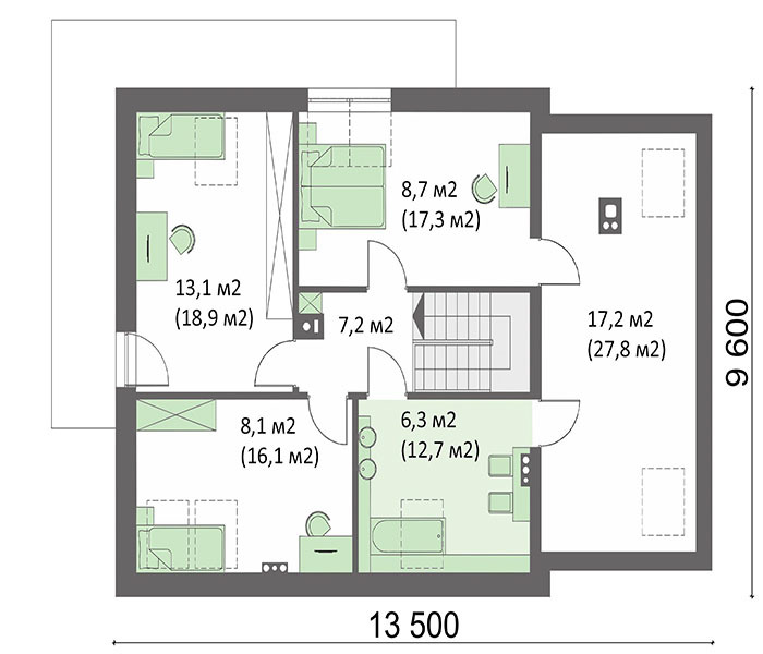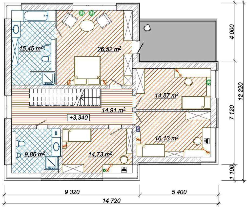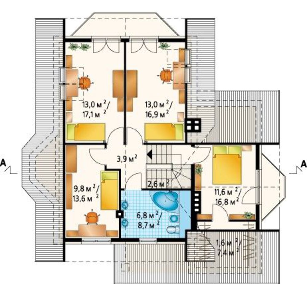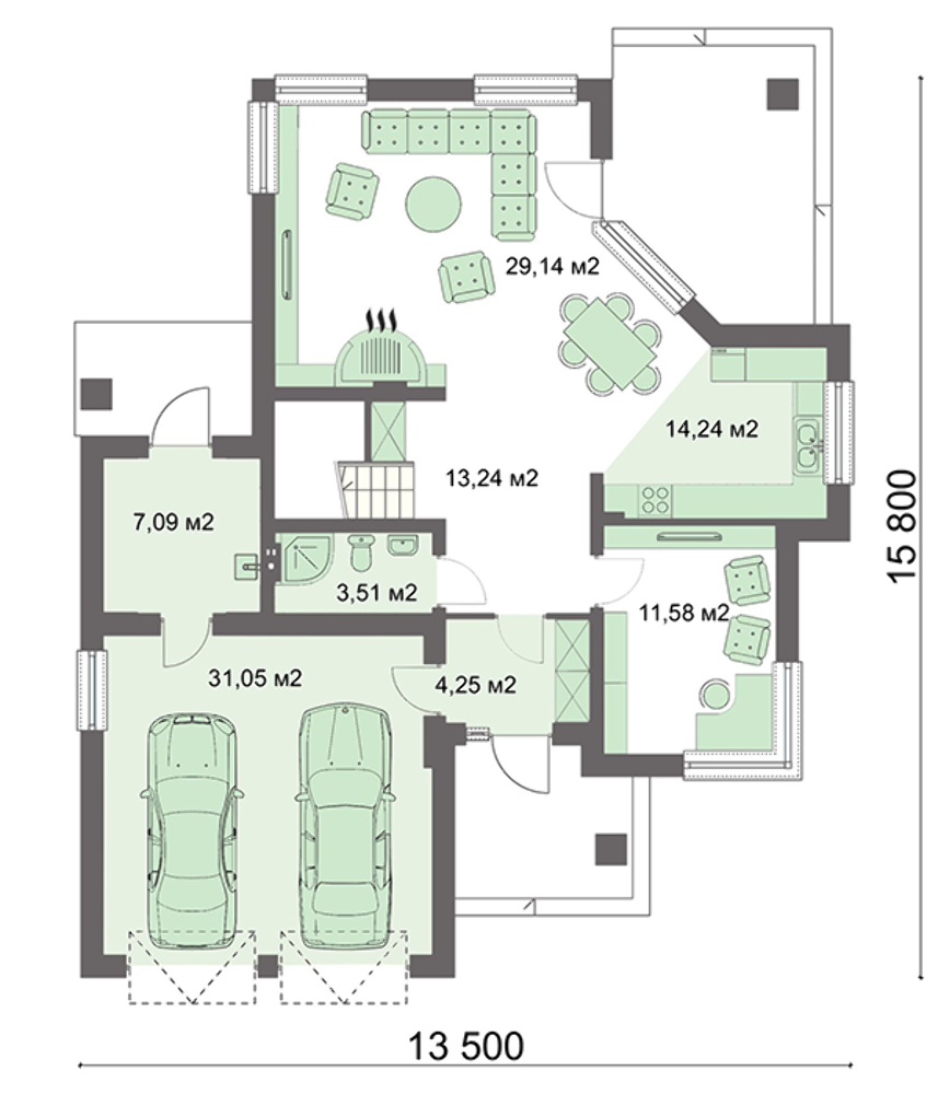 Projetado como uma área da casa para as necessidades de uma família média com um ou dois filhos. O espaço pessoal é fornecido a todos, além do total sala de estar, hall, cozinha espaçosa.