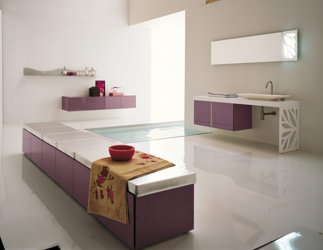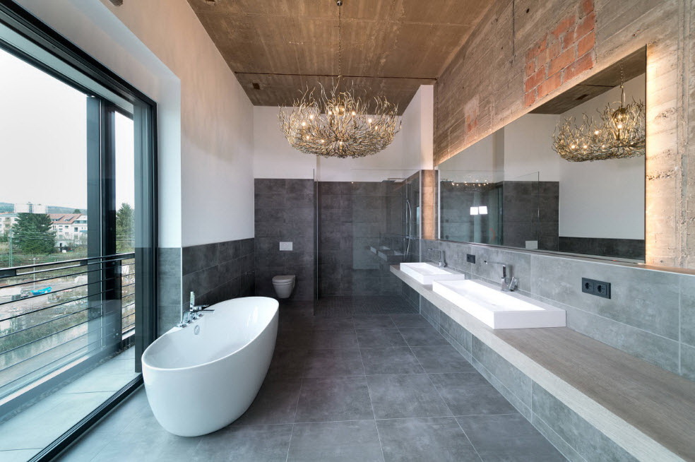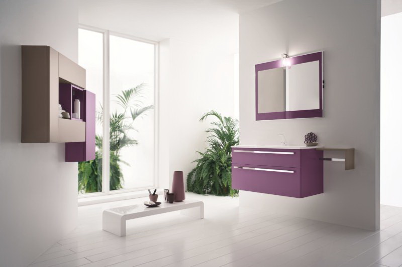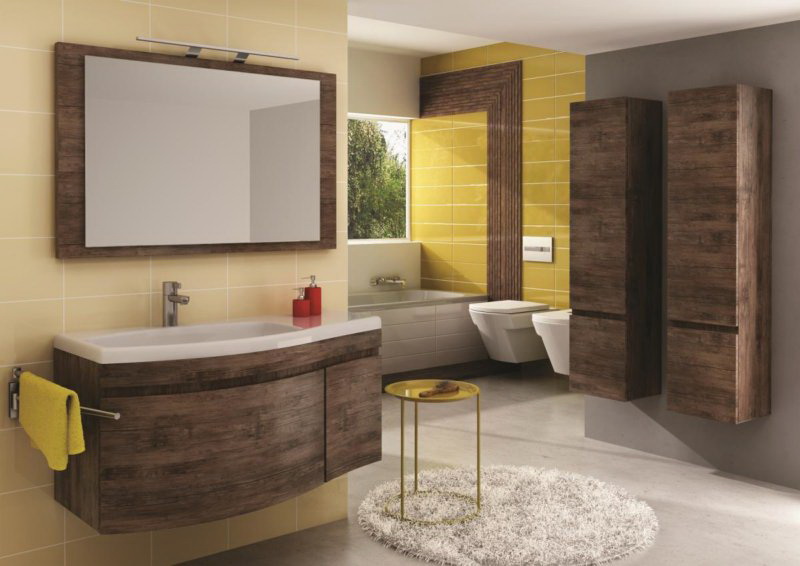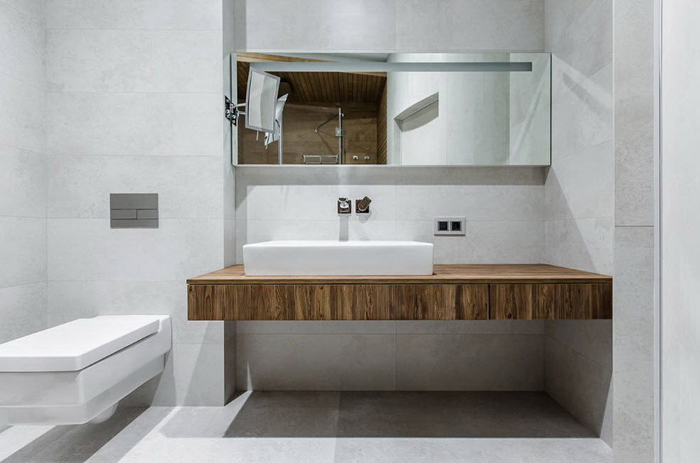 Tipo de suspensão - uma escolha frequente de designers no cenário de pequenos espaços. A ausência da base do gabinete aumenta visualmente o espaço. Devido à natureza específica da instalação, móveis volumosos não podem ser instalados na parede, porque para uma grande casa de banho, a preferência é dada ao mobiliário de exterior.