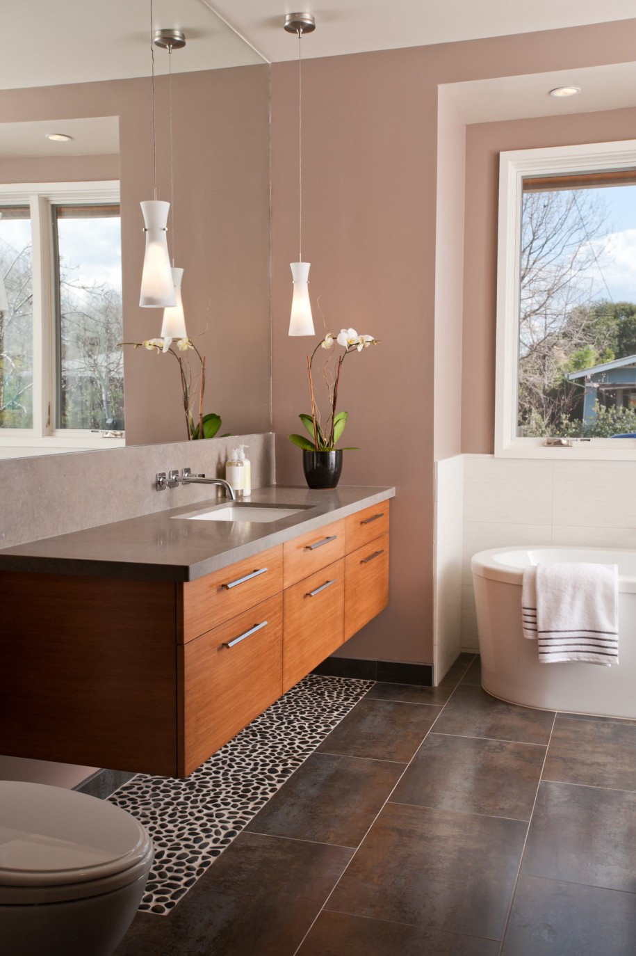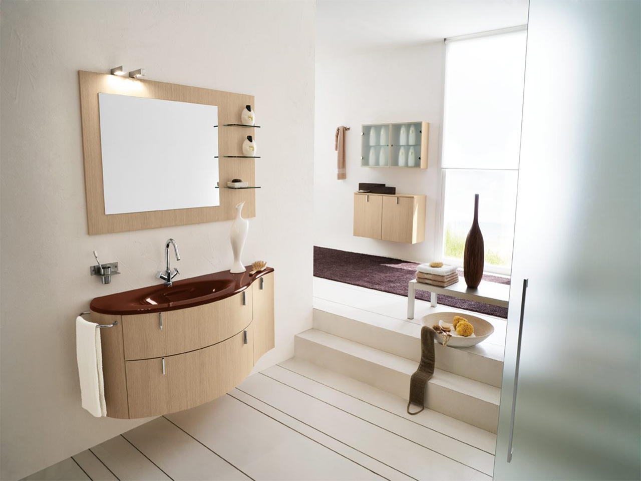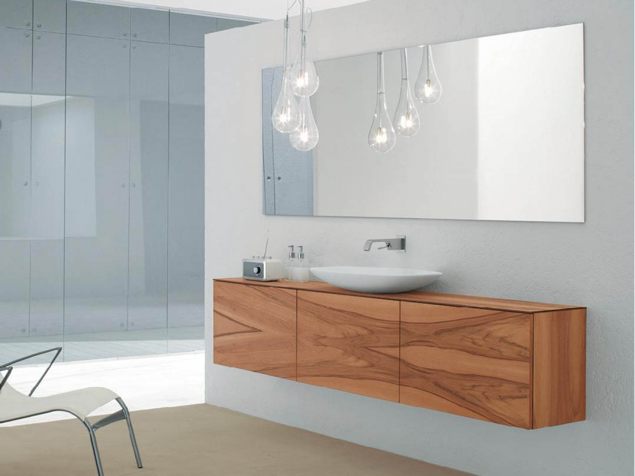 Tipo de suspensão - uma escolha frequente de designers no cenário de pequenos espaços. A ausência da base do gabinete aumenta visualmente o espaço. Devido à natureza específica da instalação, móveis volumosos não podem ser instalados na parede, porque para uma grande casa de banho, a preferência é dada ao mobiliário de exterior.
