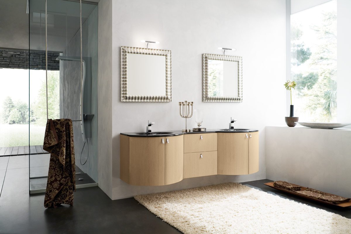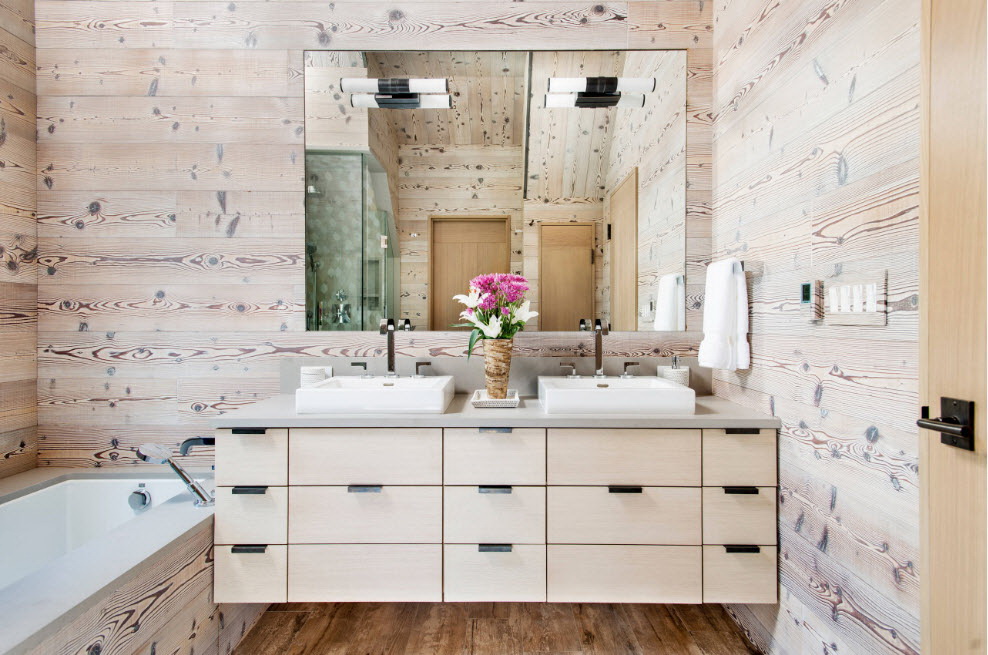 Os gabinetes mais caros com conchas são feitos de madeira natural. Eles realmente parecem luxuosos, o que sublinha o status do dono da propriedade. O contato direto de madeira com a água é carregado de conseqüências, o que deve ser levado em conta na compra.
