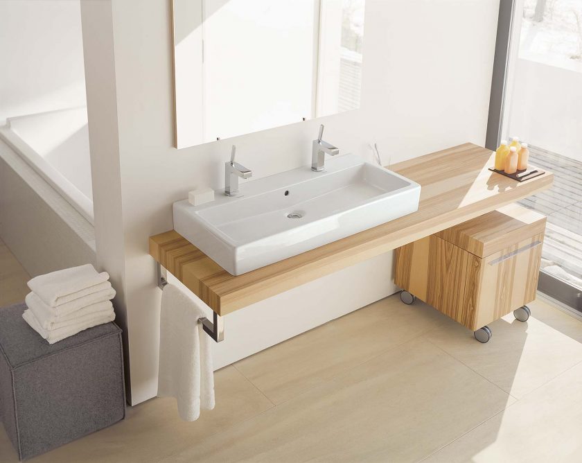 O tamanho da mesa não está limitado aos parâmetros do gabinete. Por solicitação do cliente pode fazer uma superfície maior ou mais longa, o que irá criar espaço adicional para armazenar itens de higiene pessoal. Além disso, sob ele você pode colocar uma cesta de lavanderia ou instalar uma máquina de lavar roupa.