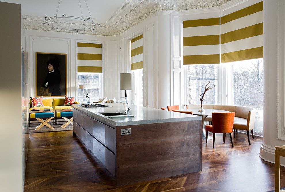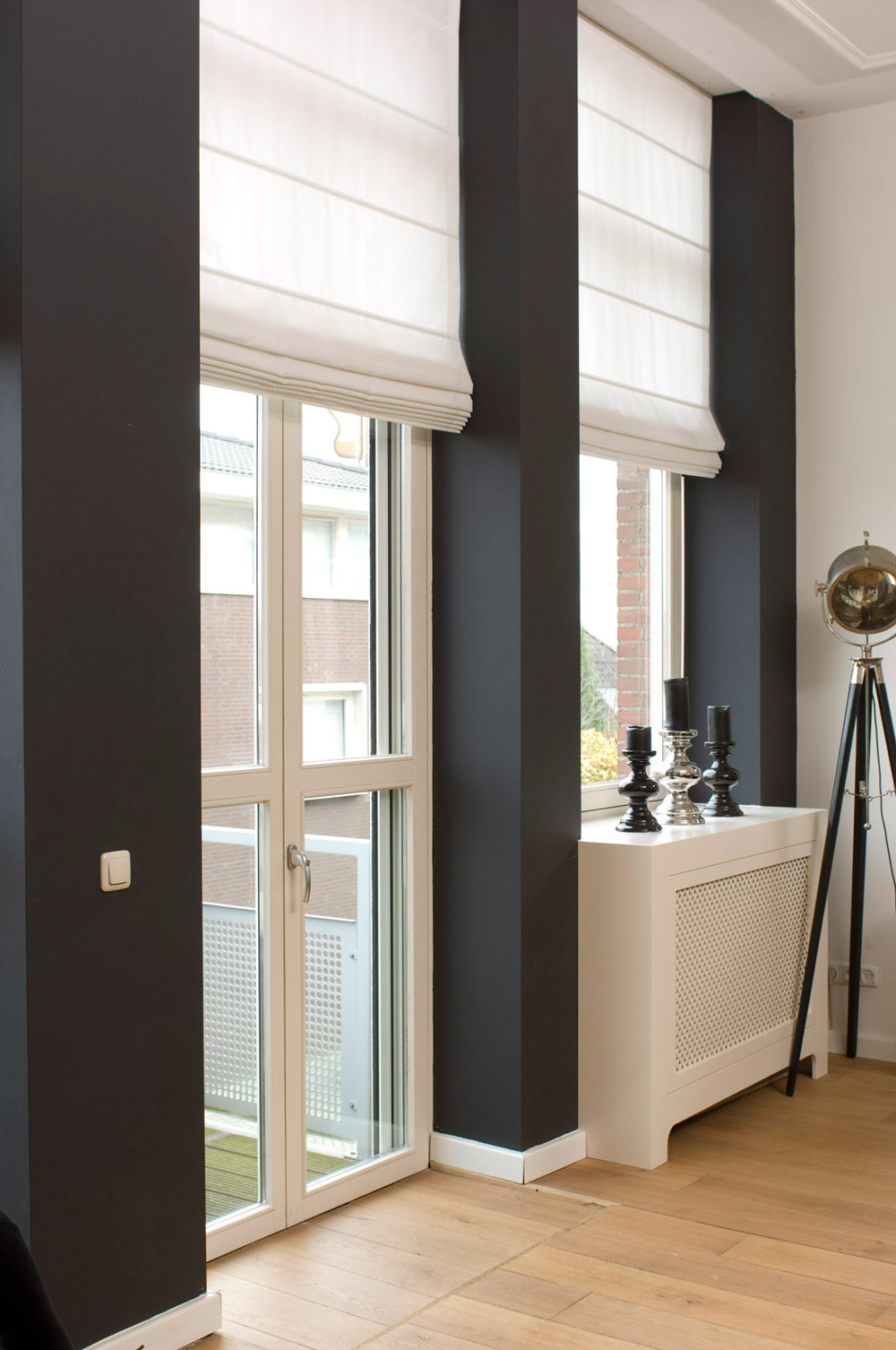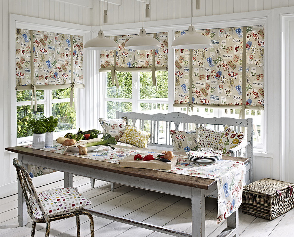 Hoje, quando arrumam as janelas da sala de estar, da cozinha e do quarto das crianças, os inquilinos costumam optar por cortinas romanas, dando ao interior uma aparência original e incomum.