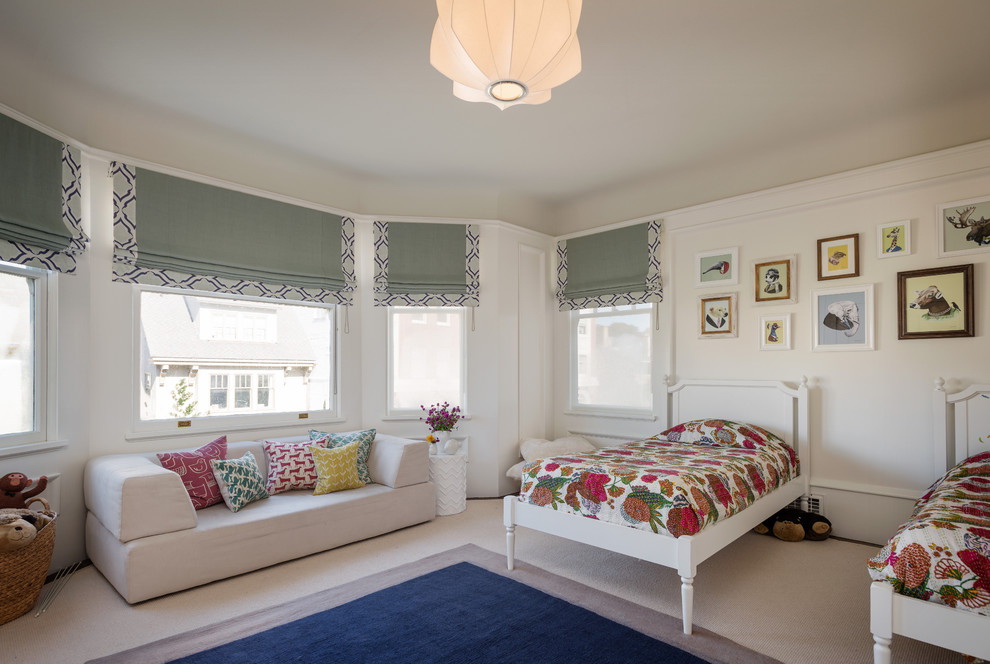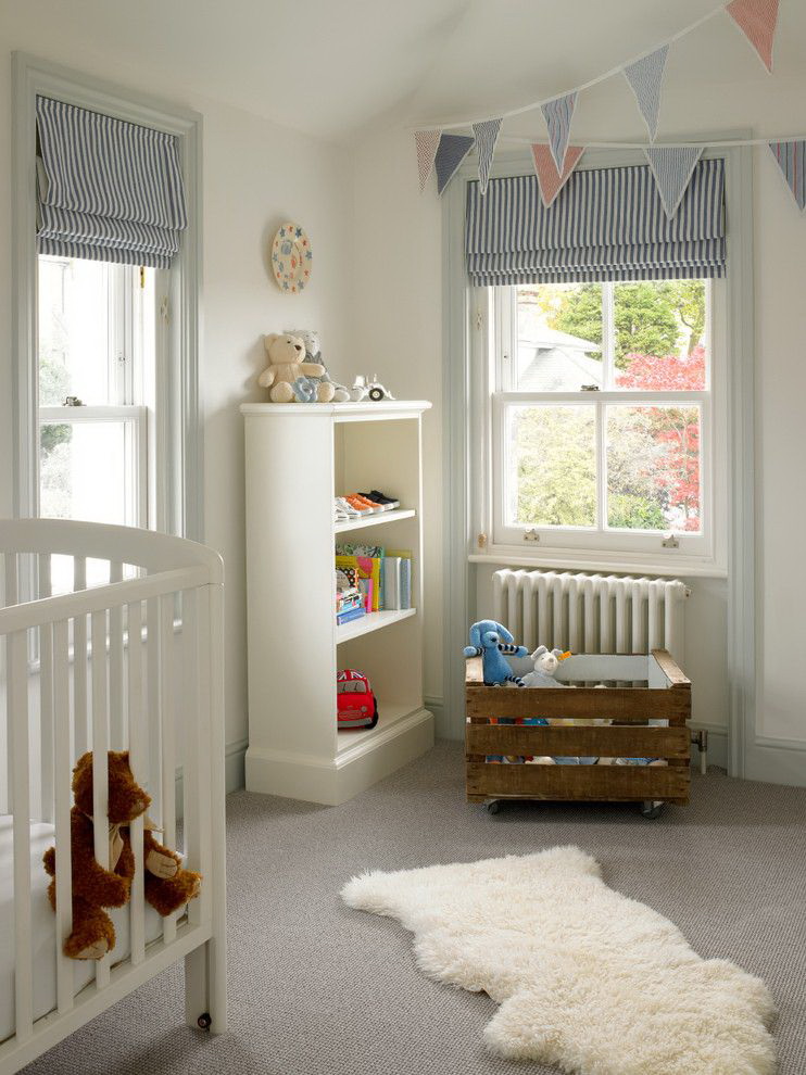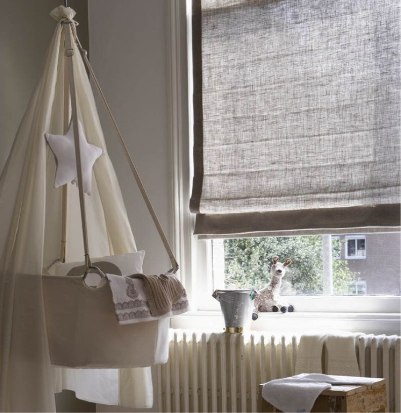 As crianças pequenas são colocadas na cama várias vezes durante o dia. Portanto, o modelo combinado será a melhor opção.É desejável complementar panos têxteis translúcidos com cortinas grossas ou cortinas. Em porteiros de crianças pequenas pode parecer muito pesado. Portanto, a instalação de cortinas romanas em duas fileiras seria uma excelente solução.