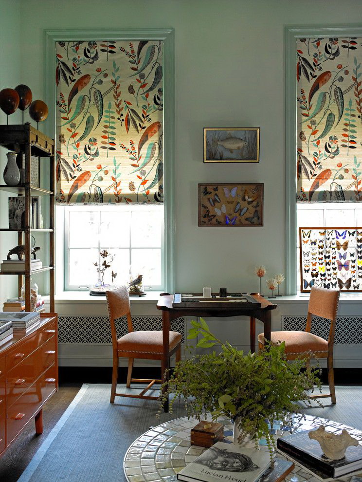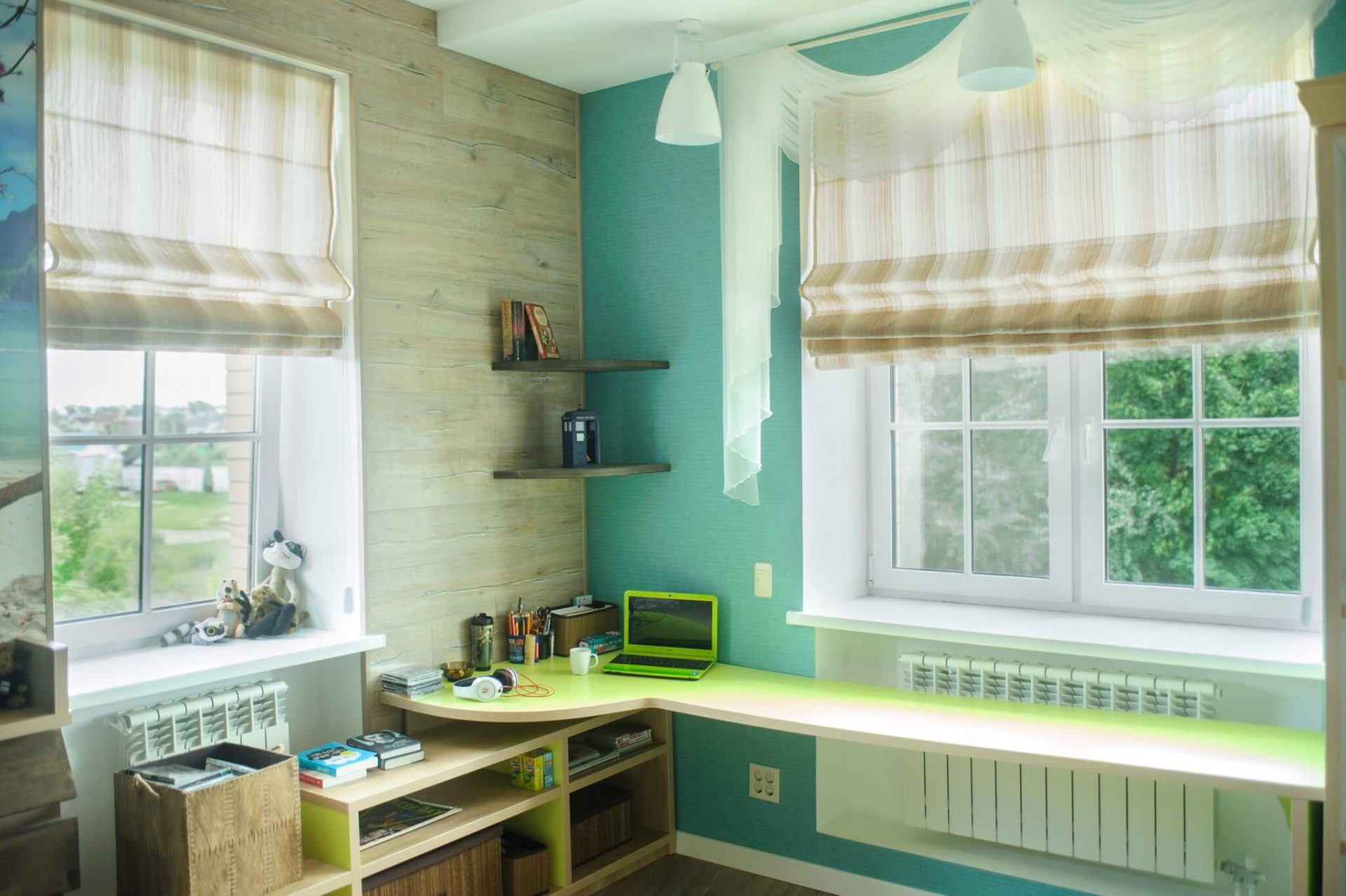 - A versão padrão - a abertura da janela é coberta apenas por uma cortina romana. A tela, ao mesmo tempo, desempenha o papel de decorar a janela e protege a sala dos raios solares. Para salas de aula, bibliotecas domésticas, cortinas densas de cores monocromáticas são mais adequadas.. Para enfatizar a gravidade do interior, para evitar o desbotamento de livros, móveis, tecidos têxteis de tons escuros são escolhidos. O espectro de cores da natureza contida - tons castanhocinza, azul, verde escuro. E já em salas de estar, cozinhas, crianças ou banheiros, você pode instalar projetos com telas estampadas translúcidas. Estes materiais não irão sombrear muito a sala e dar uma sensação de espaço, frescor;