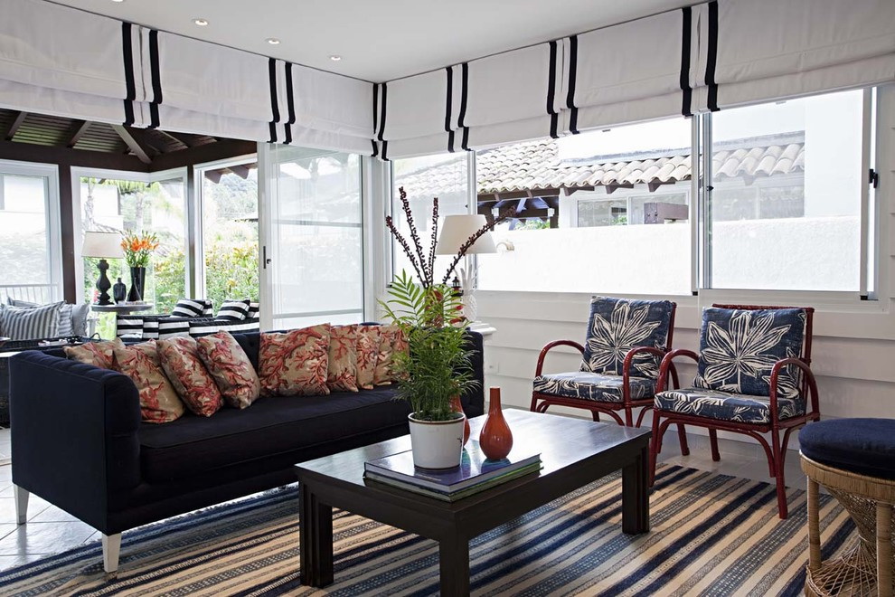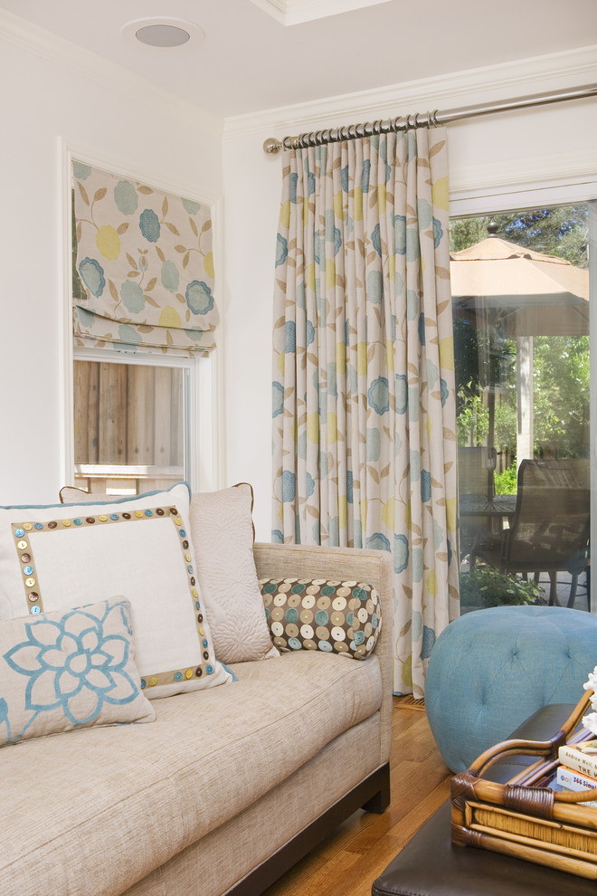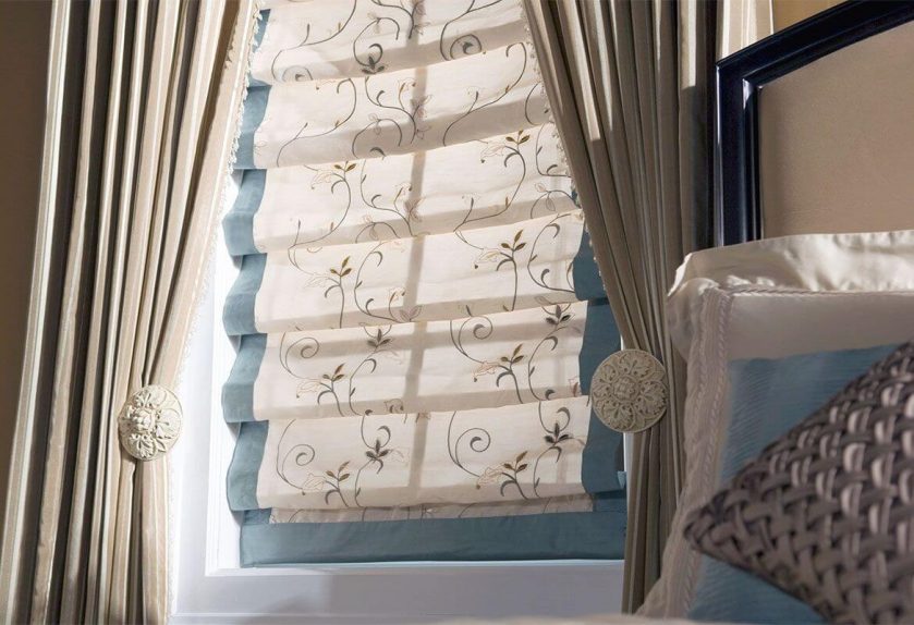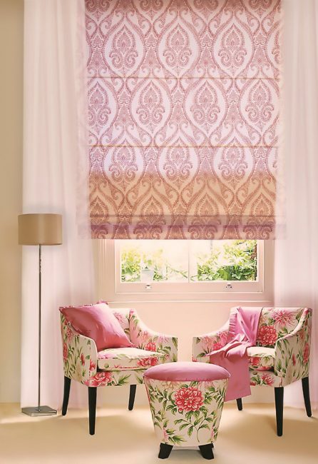 - no caso combinado, a tela é instalada na abertura da janela e serve principalmente como função de proteção. Cortinas tradicionais de tecidos de diferentes texturas e densidade tornar-se-ão magníficas companheiras para as cortinas romanas. A espessa cortina romana de linho, algodão, cetim em combinação com o tule, presa no beiral (fixada acima da abertura da janela) parece incomum. Conjuntos interessantes são obtidos selecionando materiais monofônicos e padronizados.. Para tornar o cego romano parece imperceptível, usamos tecidos de tons monocromáticos leves ou para combinar com a moldura da janela. Tais técnicas combinadas para o projeto de aberturas não parecerão padronizadas para o projeto de salas de estar, quartos e quartos de crianças.