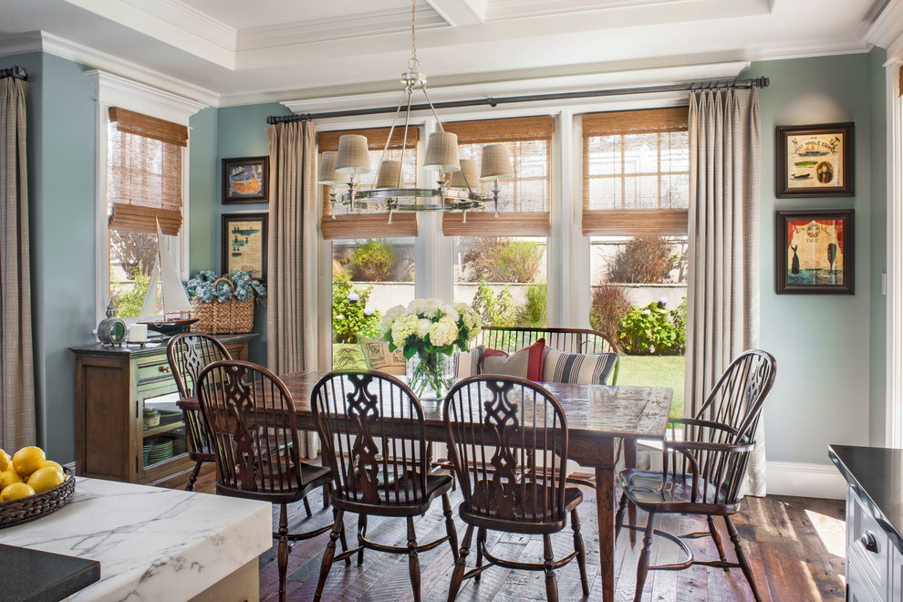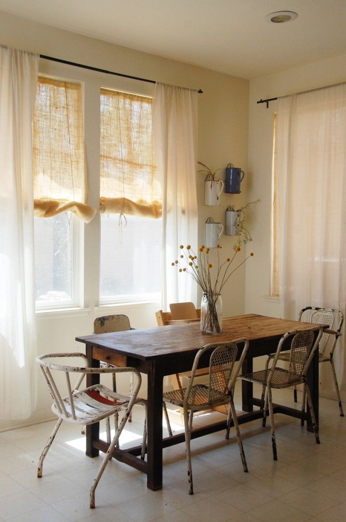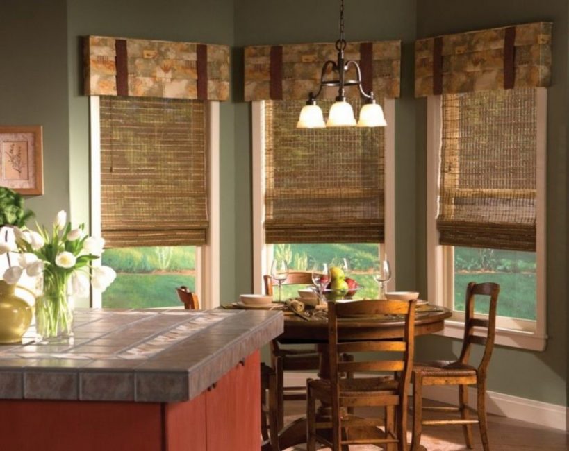 Materiais desejáveis para escolher natural (linho, algodão). Cortinas romanas com telas de bambu ou de juta se encaixam perfeitamente nos interiores dos estilos rústico ou ecológico.