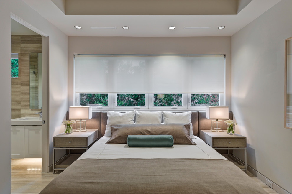 A decoração da sala deve proporcionar um descanso confortável, por isso recomenda-se instalar os produtos em um acionamento elétrico controlado remotamente. Então será fácil, sem sair da cama, fechar / abrir as cortinas ou fixá-las em um determinado nível.