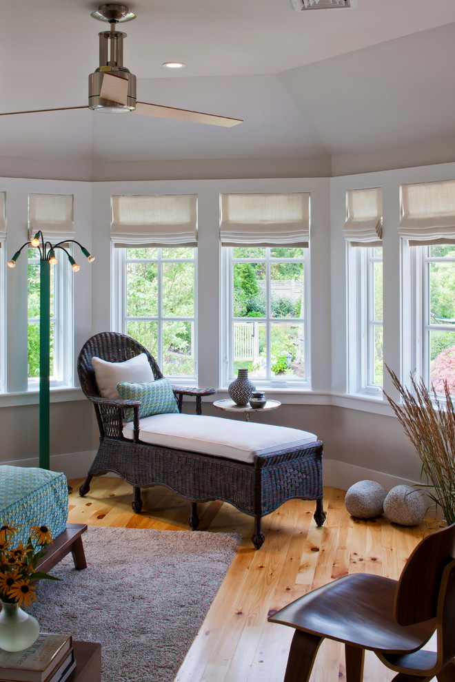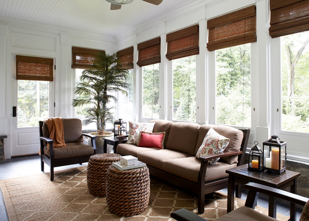 A decoração mais comum das janelas da sacada é a palha de bambu. Este material dá conforto e conforto ao quarto em qualquer época do ano.