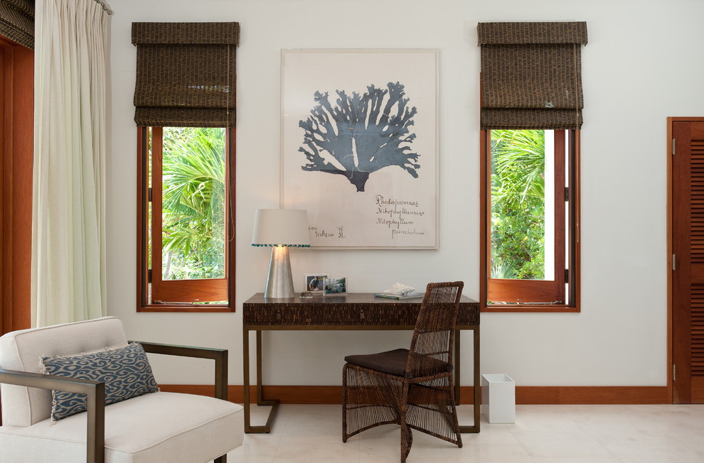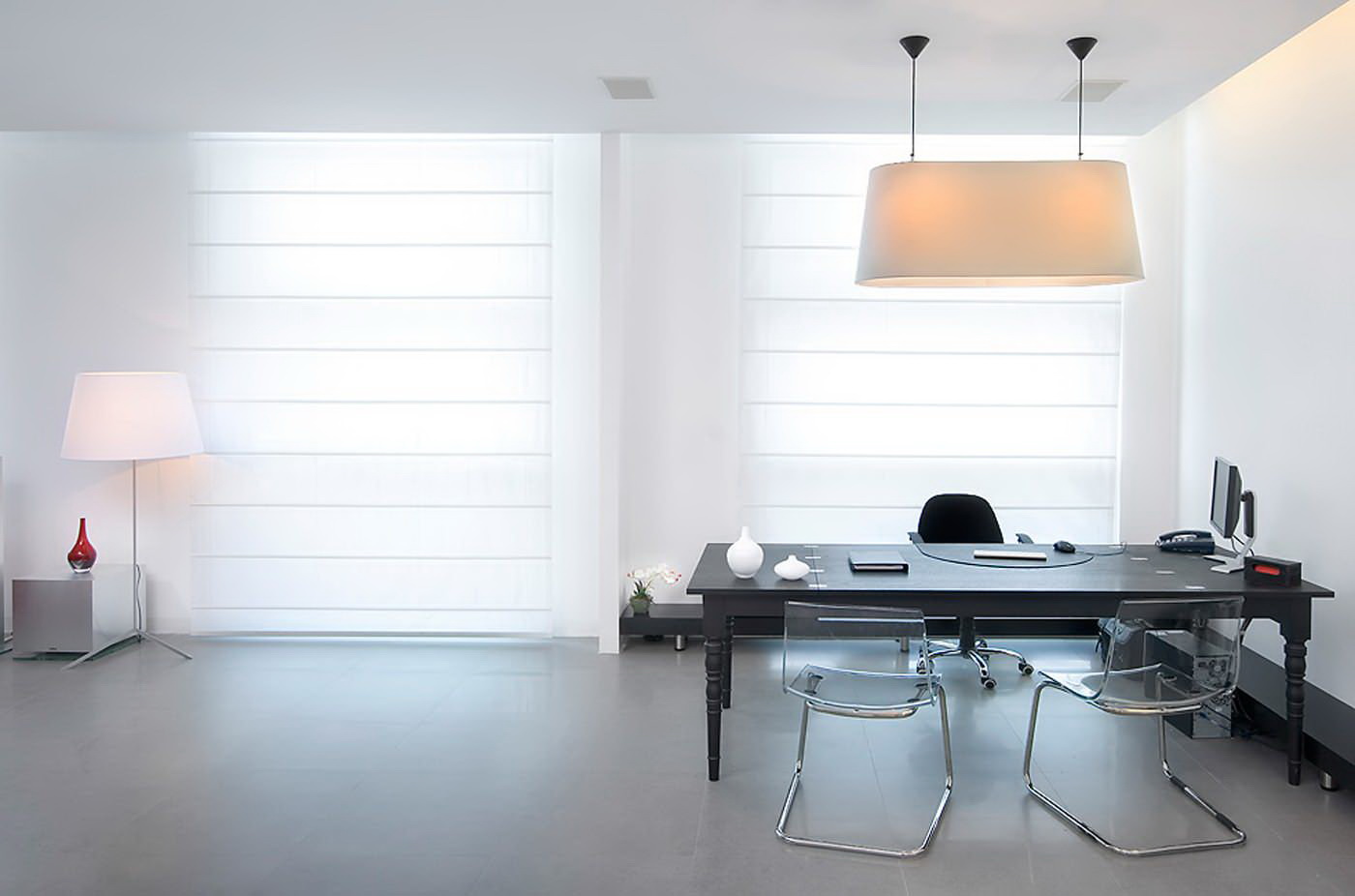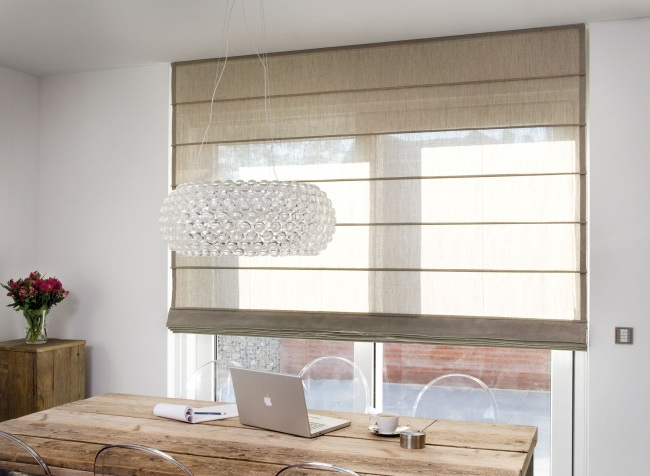 Cortinas romanas irão originalmente decorar as janelas de escritórios rigorosos e aconchegantes salas de estar, irão se encaixar com sucesso na atmosfera de um pequeno escritório em casa ou em um amplo salão de reuniões.