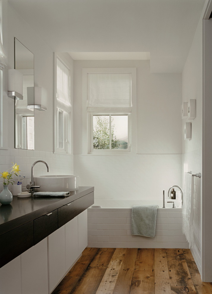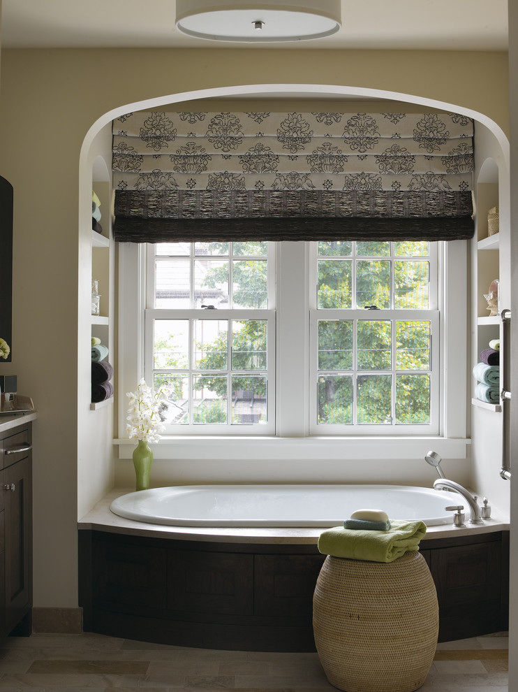 Toda mulher sonha com um banheiro com uma janela - é bom ver uma cidade acordando pela manhã. Para aberturas de decoração escolher cortinas de tecidos grossos ou de tecidos finos no forro, de modo que no escuro eles não brilham. Os fabricantes costuram cortinas de materiais de várias tonalidades. Não subestime as persianas romanas - elas tornam os banheiros muito elegantes e modernos.