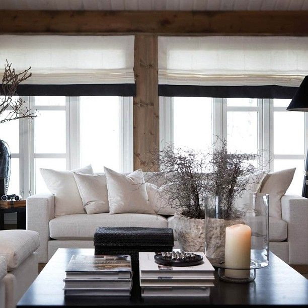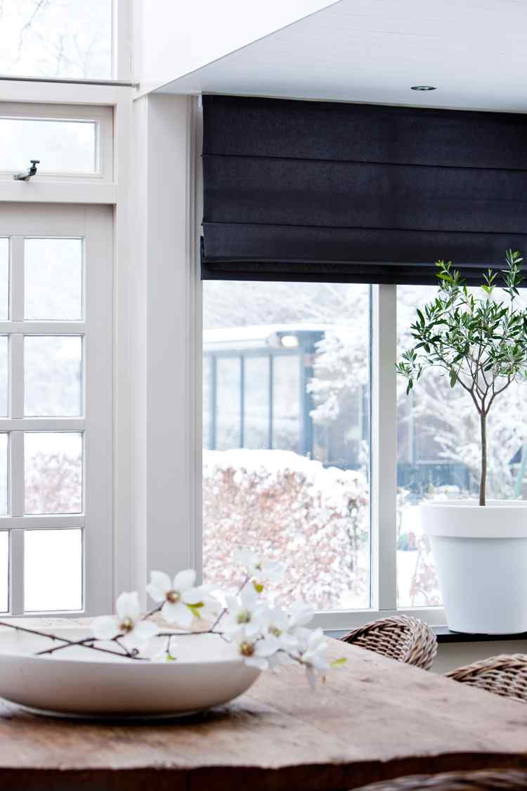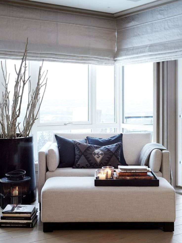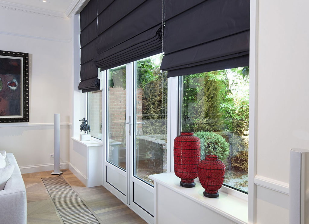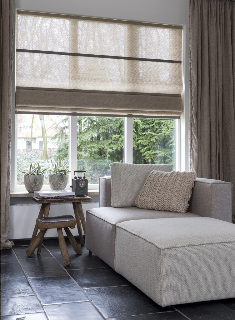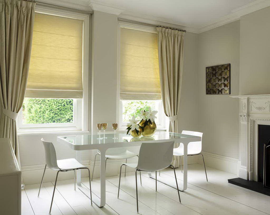 - Cortinas romanas em conjunto com persianas horizontais / verticais são adequadas para interiores de estilo moderno;