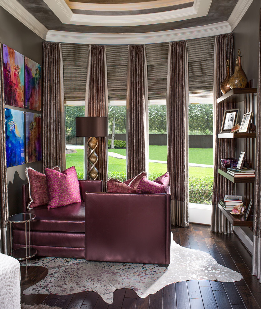 - quando o interior é dominado por ornamentos e padrões (tapetes, papel de parede com estampas, estofamento de móveis estampados), e depois as janelas pendurar telas monocromáticas cores calmas. A fim de criar uma atmosfera pacífica dentro de casa, é preferível escolher tecidos de companhia. Isto é, a sombra / padrão das cortinas repete a cor do estofo do mobiliário ou algum elemento do padrão do revestimento do chão ou dos estofos em tecido;