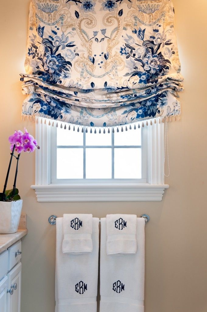 - para banheiros com interiores clássicos, tons pastel são adequados. Tecidos com ornamentos de tamanho médio prateado / dourado parecem originais;