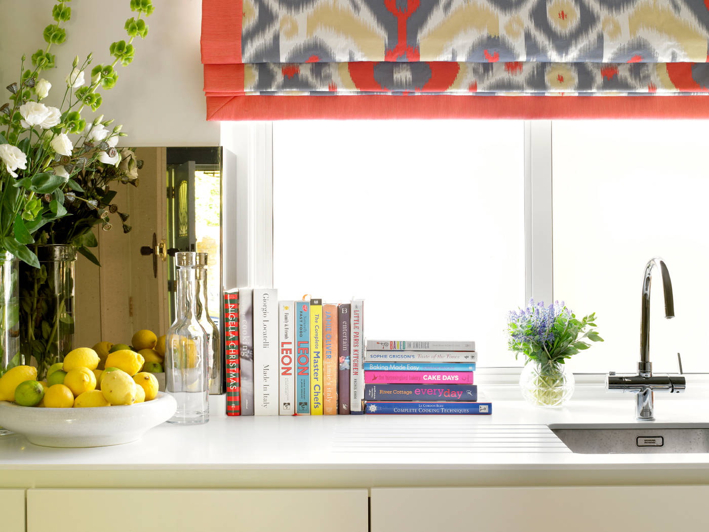 - a cozinha em tons de amarelo claro complementará organicamente a tela têxtil de tons de laranja e oliva;