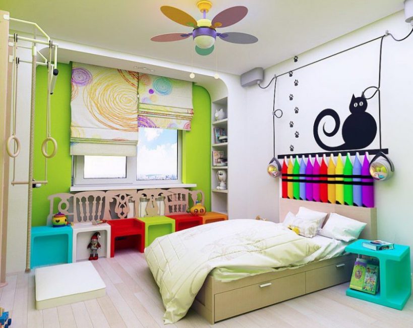 Para que a situação se torne mais lúdica por natureza, você deve prestar atenção às telas com desenhos (bolinhas, pequeno ornamento geométrico, pequeno padrão floral). Muito gentilmente parecerá uma pequena faixa ou célula. Meninas definitivamente gostam de materiais com a imagem de seus personagens favoritos de desenhos animados.