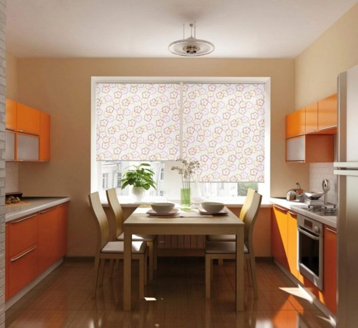 Alta umidade e temperatura são hóspedes frequentes na cozinha. Se a janela está localizada ao lado do fogão, em seguida, ao longo do tempo, gotas de gordura, água, certifique-se de "decorar" as cortinas. Portanto, para a cozinha, as cortinas são costuradas a partir de tecidos que são fáceis de cuidar. Permita perfeitamente as cortinas de lavagens frequentes feitas de materiais sintéticos. Tais materiais são baratos (para decoração de janela de costura precisa de tecido) e você pode alterá-los.