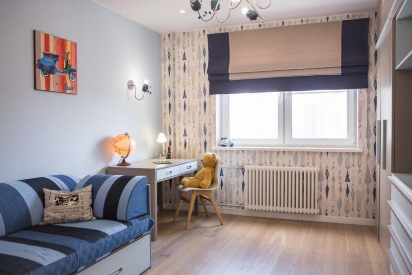 Para terminar o quarto do menino, os pais costumam escolher cores discretas (tons de cinza, azul, verde). Você pode diluir o design estrito ou lacônico da sala para a criança com uma decoração de janela incomum. Os tecidos listrados ou xadrez dependem do gosto da criança e dos desejos dos pais.