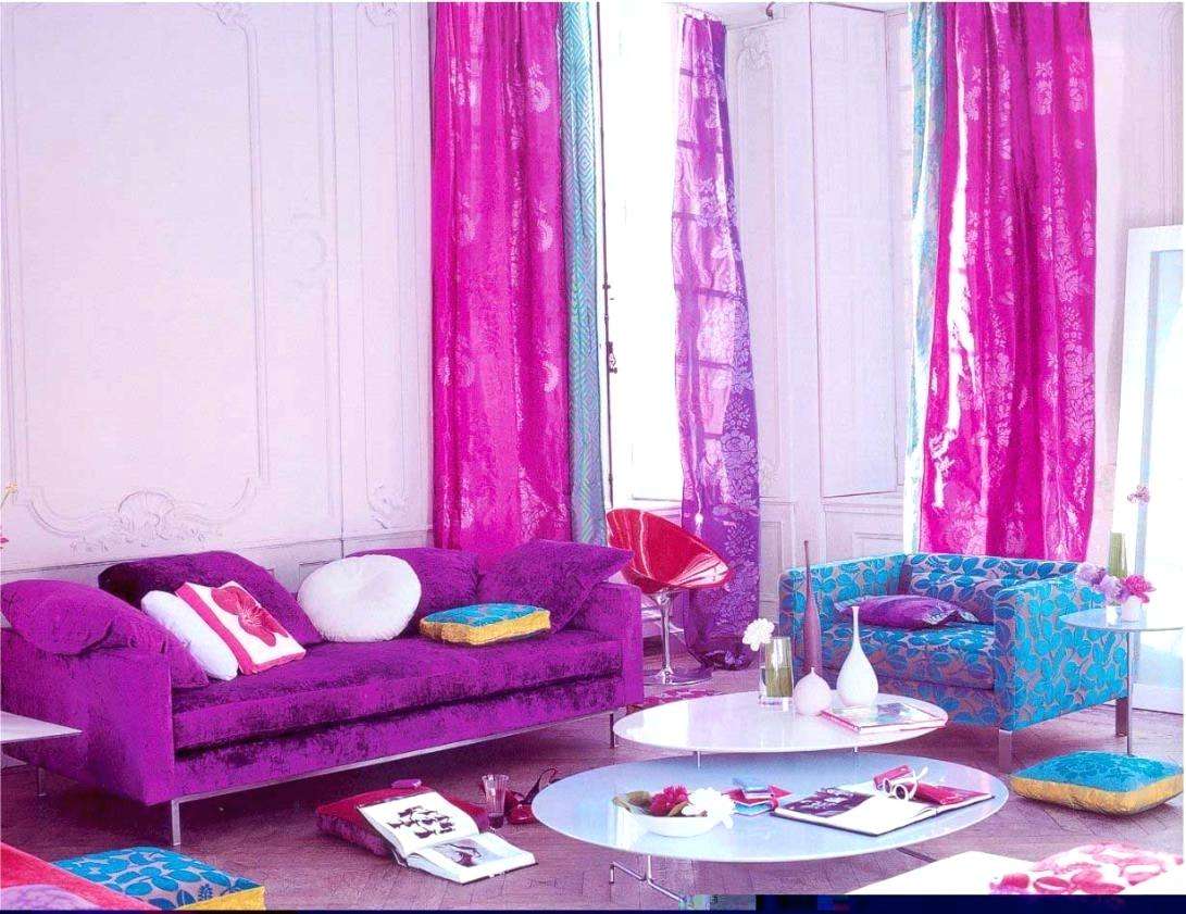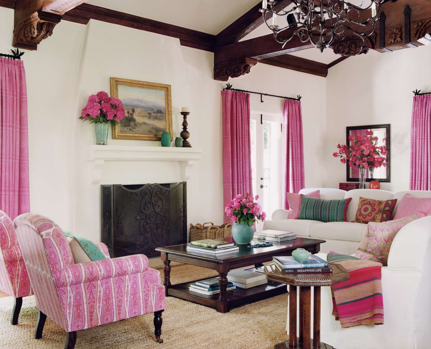 A cor rosa é amplamente usada para recriar motivos étnicos. Se você quer uma sala de estar com notas sulistas apaixonadas, feitas em estilos árabes, mexicanos, indianos ou marroquinos, use ornamentos coloridos. Por exemplo, carmesim ou roxo profundo podem ser combinados com tons totalmente incompatíveis, à primeira vista. Eles podem ser esmeralda, turquesa, tinta laranja.