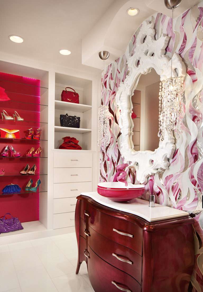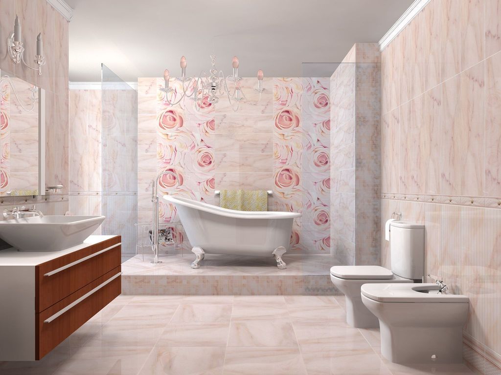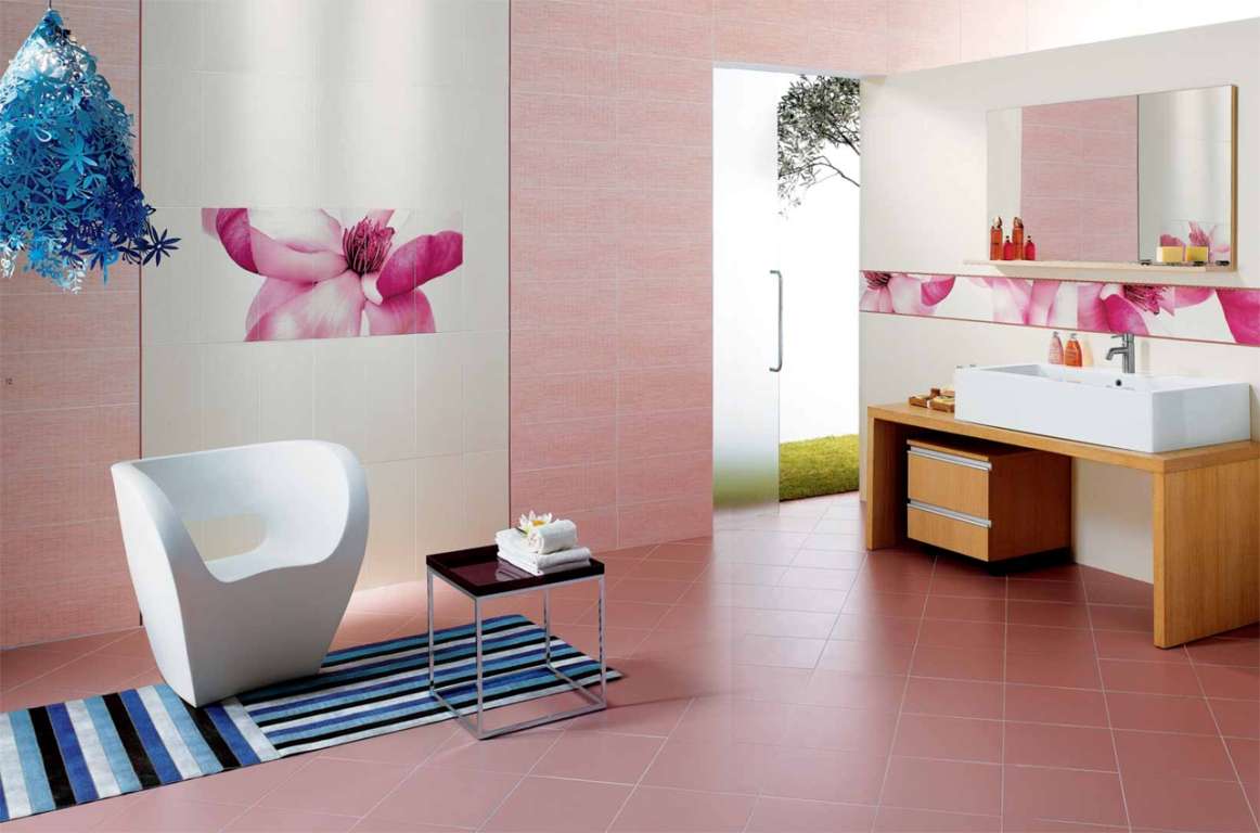 Se você tiver espaço suficiente na sala e organizá-lo em um estilo glamouroso, será apropriado colocar um vaso de piso branco como a neve. O espelho com bordas suaves de morango revitalizam o banheiro. Ênfase pode ser mudada para florida o lustre - O principal é escolher o tamanho certo. Bem, o toque final será o padrão tapeteslocalizado no banho e WC.