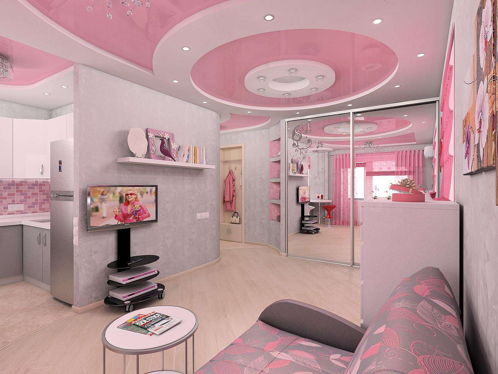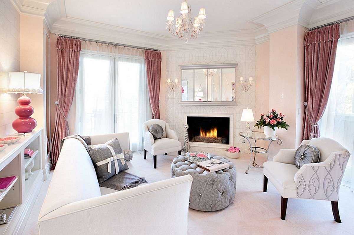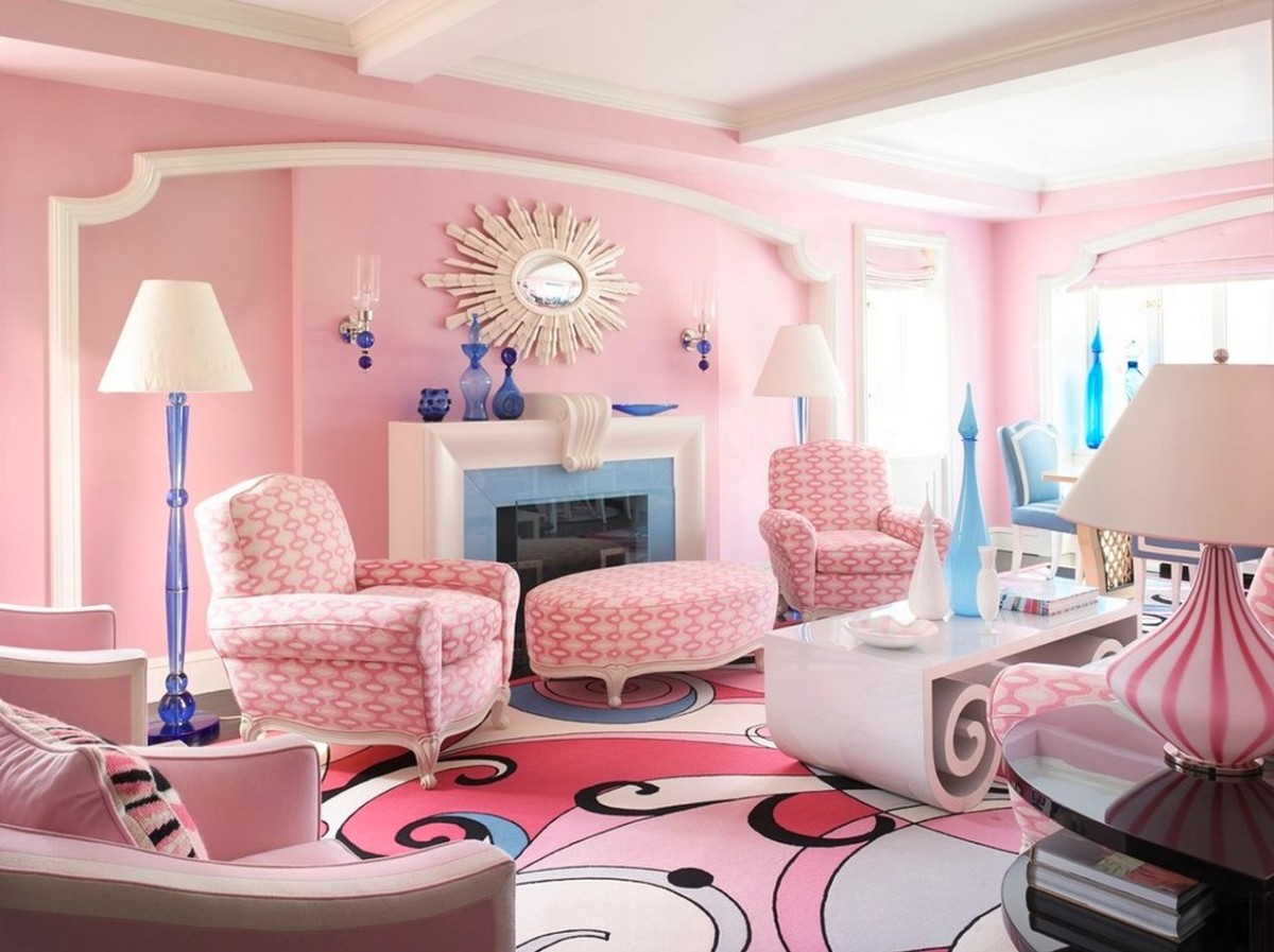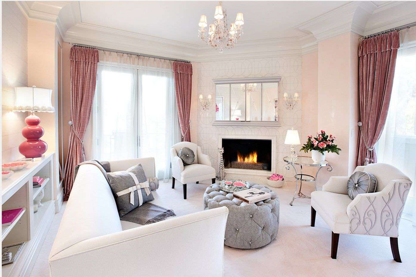 Considere que tal interior pode em breve tornar-se muito chato. Para evitar que isso aconteça, esqueça a cor rosa brilhante e use apenas cores pastel, complementando-a com um tom suave de creme, creme ou vermelho. Sala de estar será arejado e romântico, será uma verdadeira salvação para as mulheres que são propensas à manifestação de depressão e ocupam uma posição estressante. Para agradar aos homens, você pode diluir a sala de estar de marshmallow com detalhes em preto, chocolate ou azul.