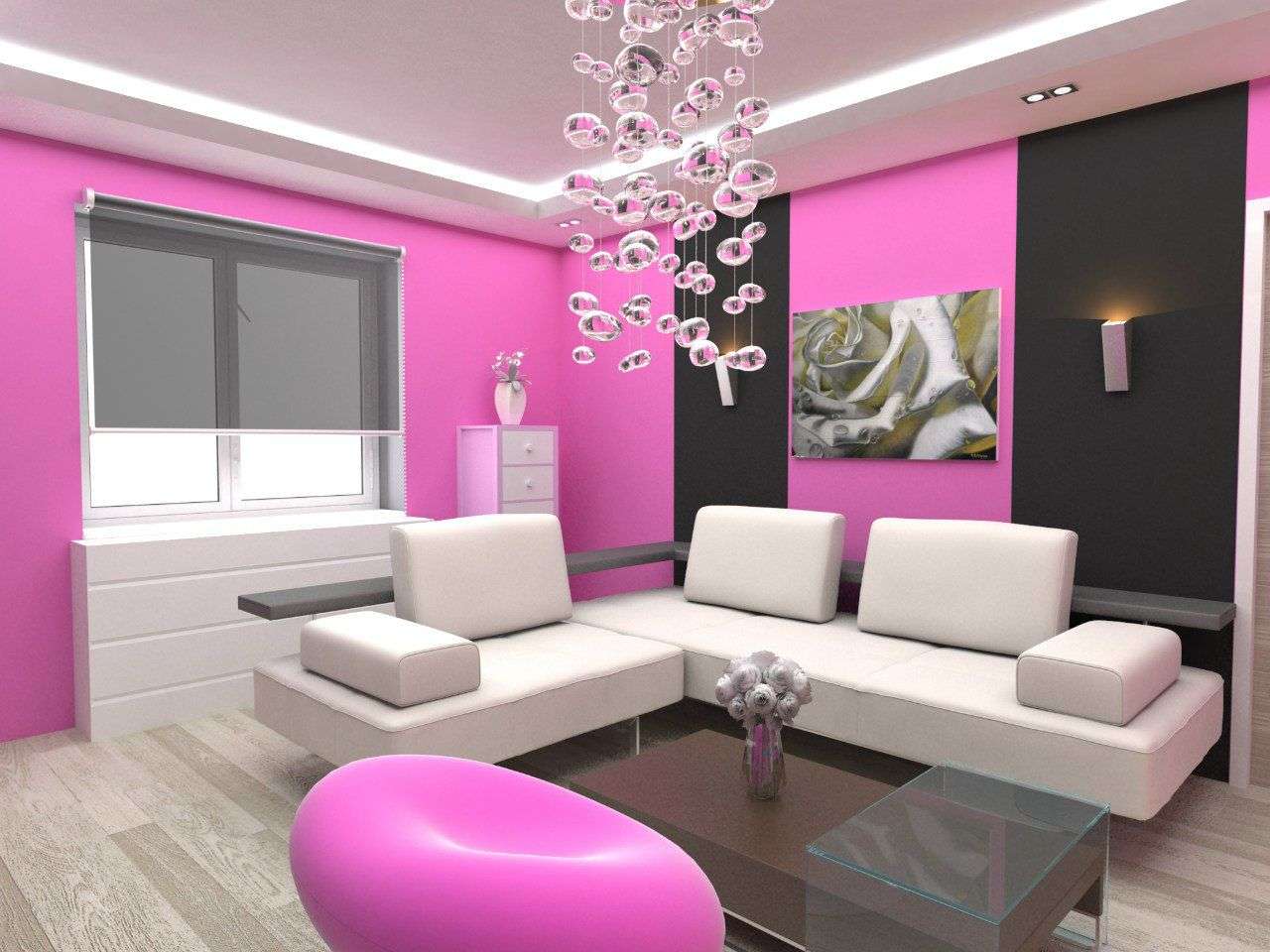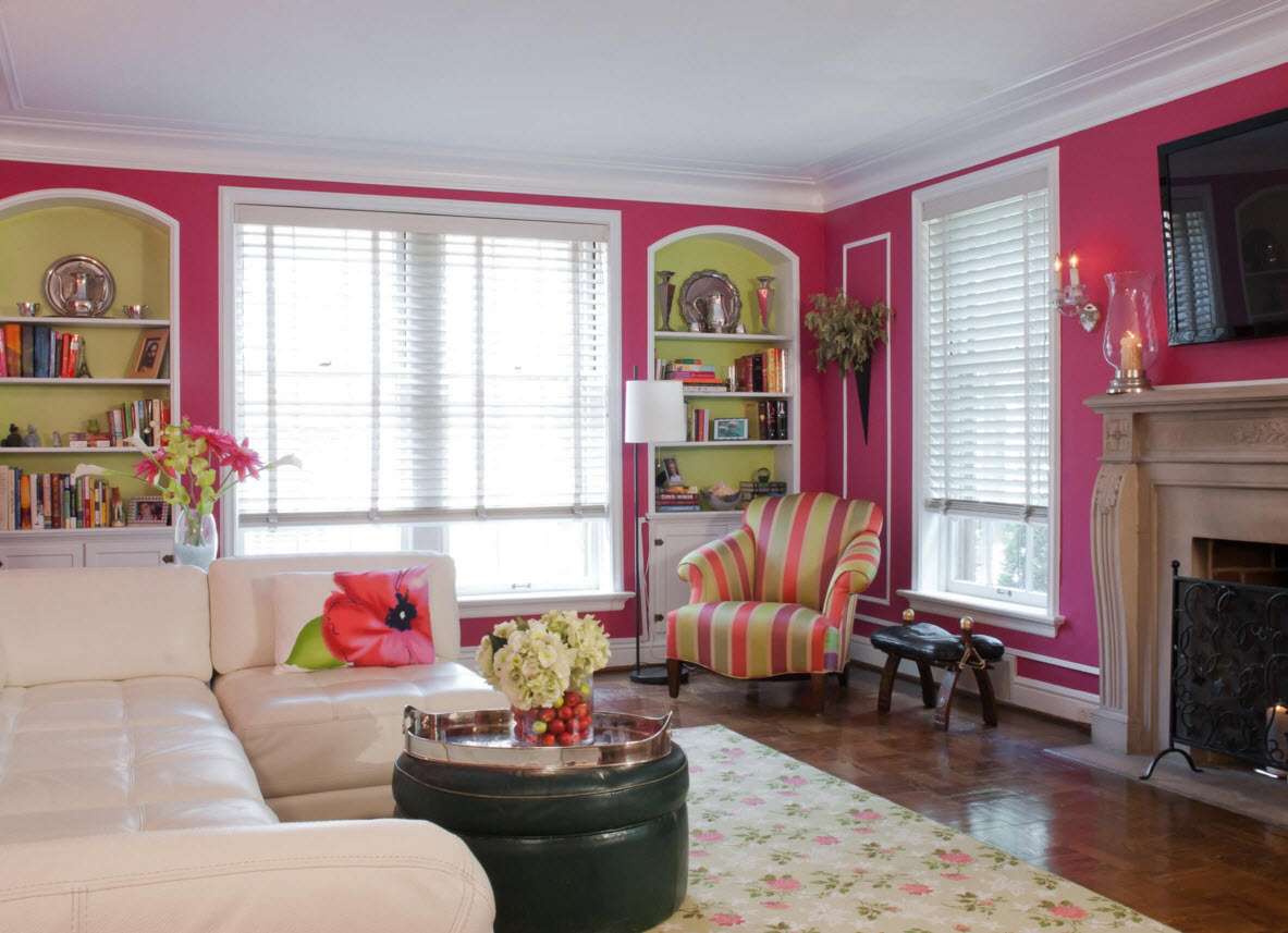Se você quiser fazer uma sala iluminada em estilo moderno, móveis ou acessórios em tons de rosa-ácido serão úteis. Lembre-se da importância do tamanho da sala - quanto menor ela for, mais fino deverá ser o enfeite. O rosa brilhante atrai tanto a atenção que, mesmo em uma sala bege ou branca neutra, dois ou três acentos criam a impressão de um quarto totalmente cor-de-rosa.