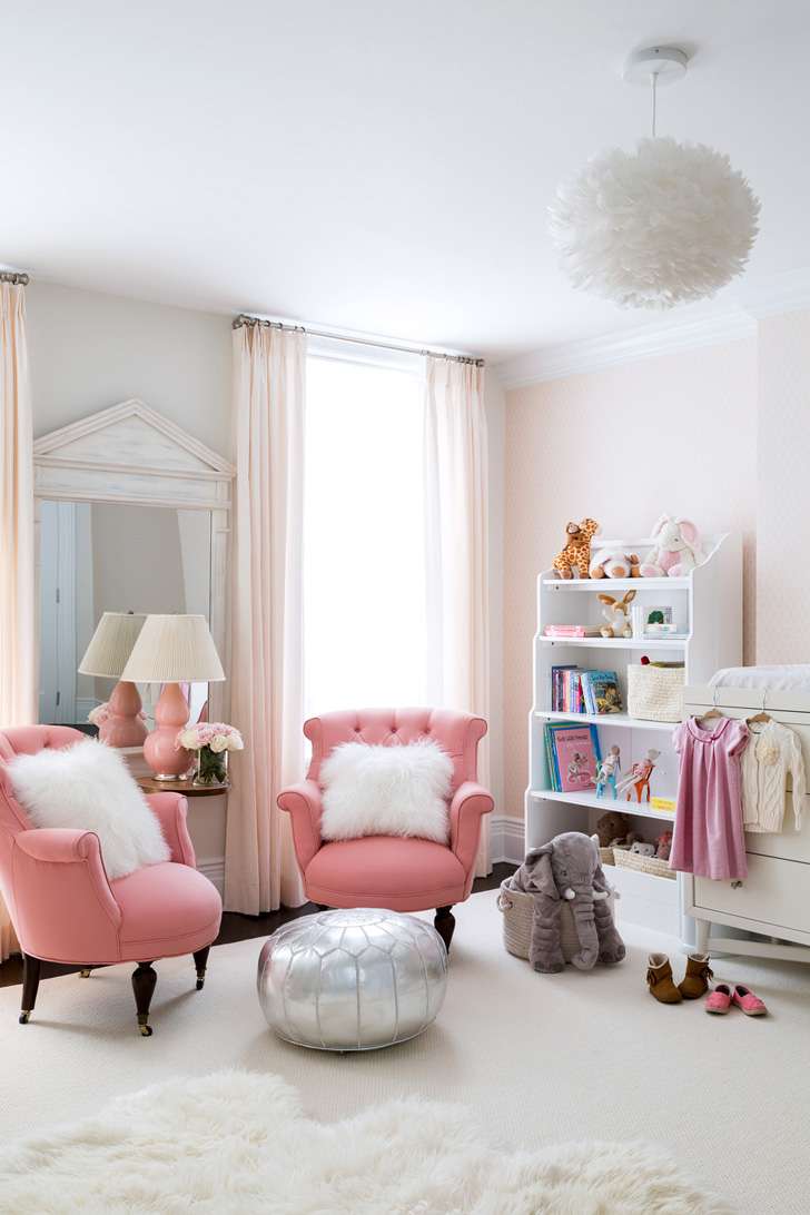- Rosa frio. Esqueça que o viveiro deve ser brilhante, enjoativo e se assemelhar a chicletes químicos.Sombra rosa fria tem o direito de existir, é bem adequado para uma sala com grandes janelas e boa iluminação. Rosa pálido servirá como uma excelente cor de base, enquanto tons mais brilhantes de rosa servirão como acentos. Eles são cortinas, brinquedos, travesseirosestofos e imagens.