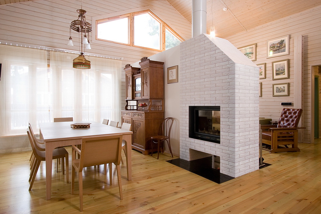 Este modelo pode ser equipado com um fogão, uma grande espreguiçadeira, que pode ser decorada com tecidos leves. Muitas vezes, os designers oferecem para instalá-lo perto da parede e da parte de aquecimento para fazer na sala ao lado. Isso dará a oportunidade de obter um fogão russo multifuncional na cozinha e uma bela lareira na sala de estar.