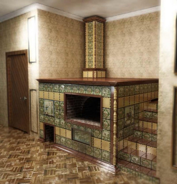 Uma ótima opção seria usar telhas. Eles são capazes de decorar o fogão e dar-lhe o sabor russo original. Estes fornos são funcionais - há uma placa, uma espreguiçadeira grande e confortável. Você pode instalá-lo de tal forma que a parte funcional esteja na cozinha, e a fornalha decorativa esteja em sala de estar. Isso dará a oportunidade de apreciar o efeito de uma chama aberta e um leve estalar de lenha.