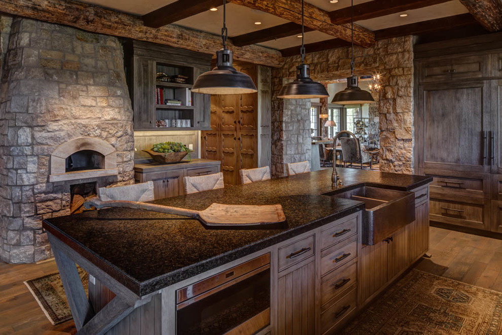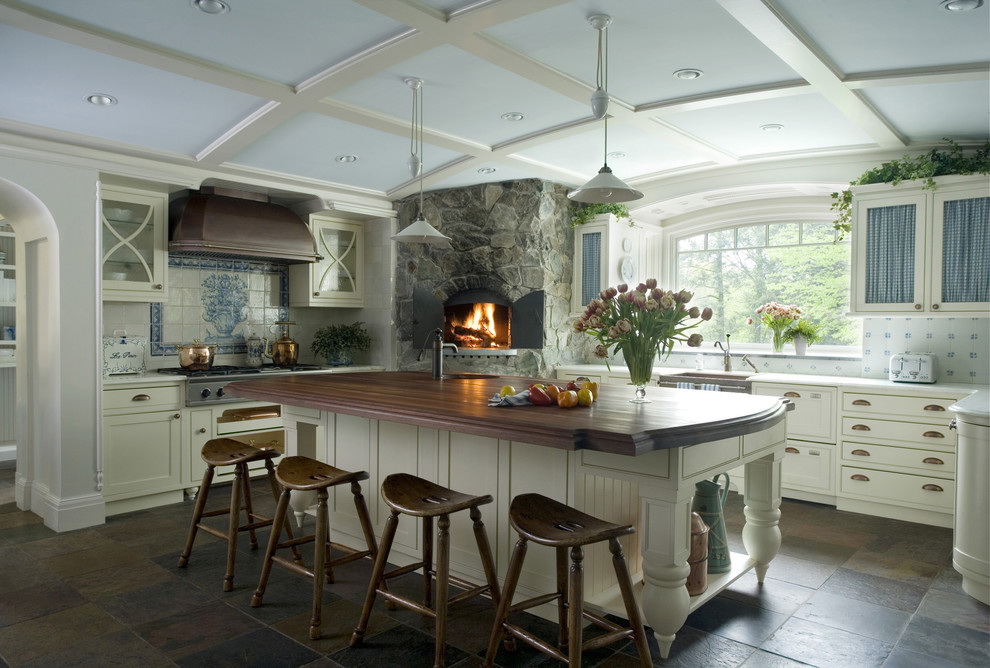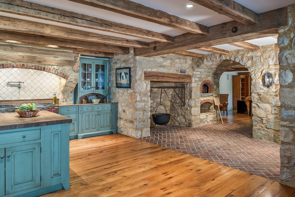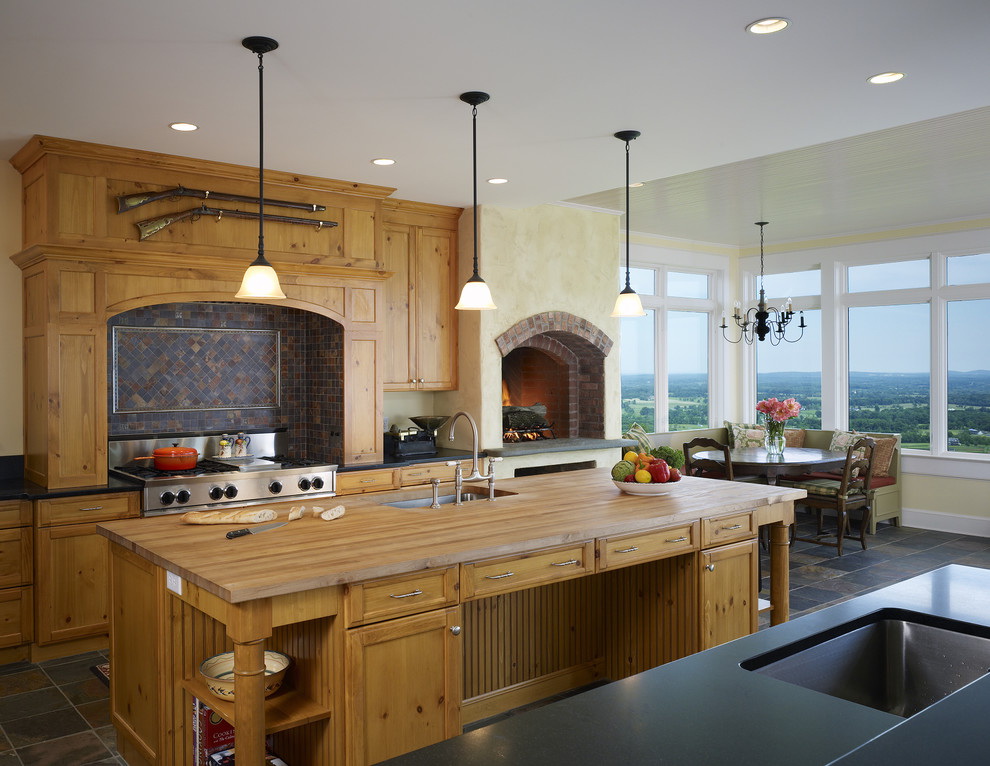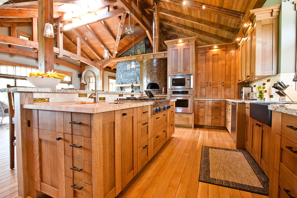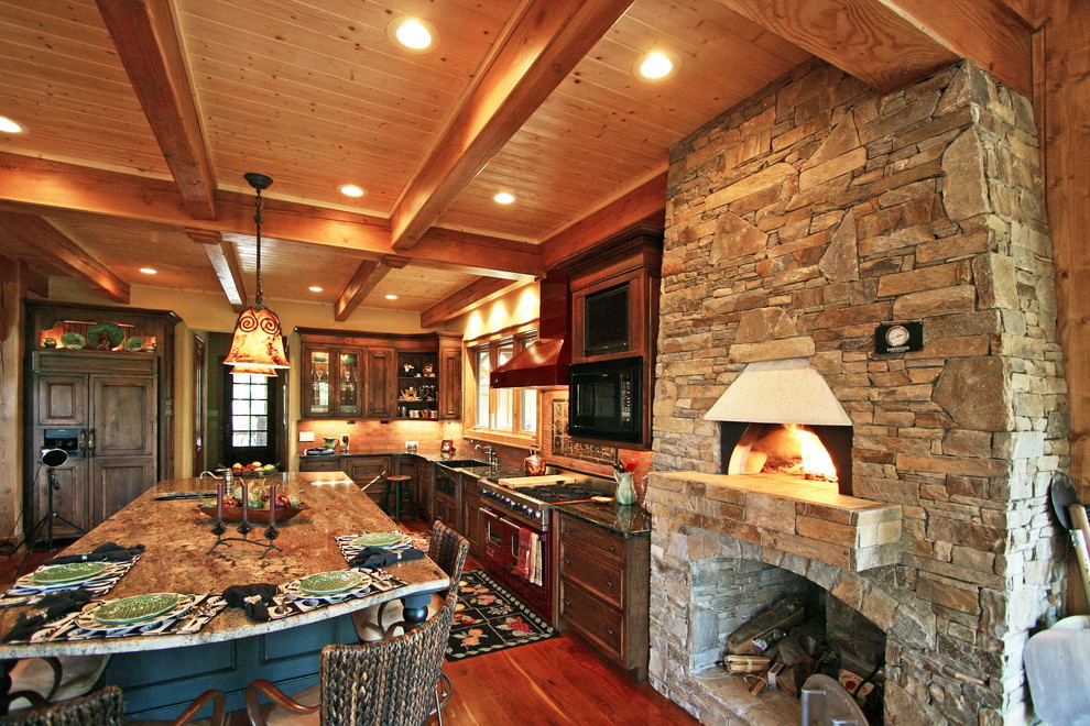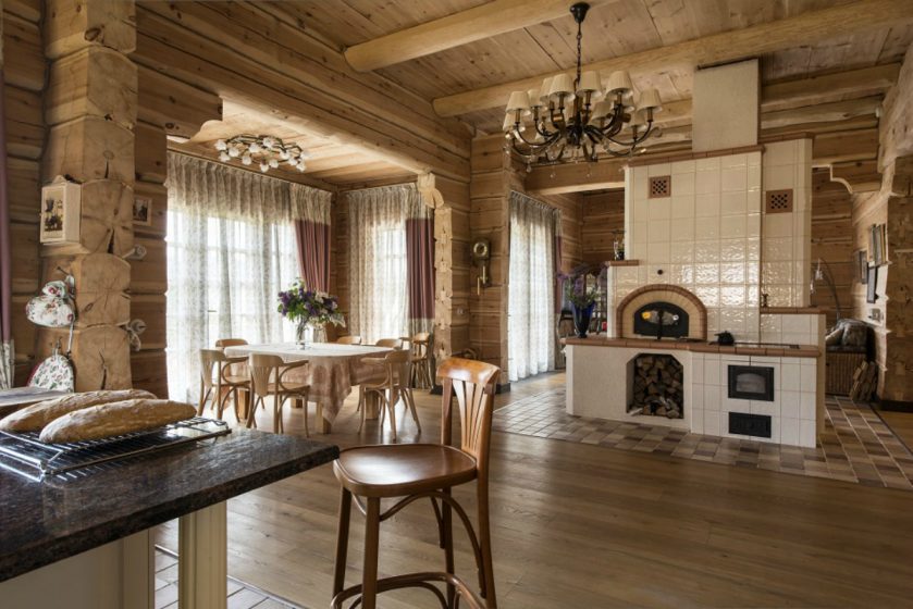 Se você escolher um design para uma casa de madeira, é melhor dar preferência a um estilo verdadeiramente russo. A decoração pode ser feita de várias maneiras: usando materiais de construção (gesso e tinta) ou argamassas tradicionais. Tais desenhos irão harmoniosamente olhar e encher a cozinha com aconchego e conforto.