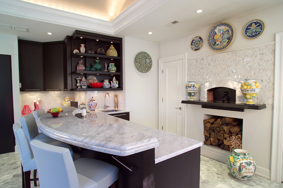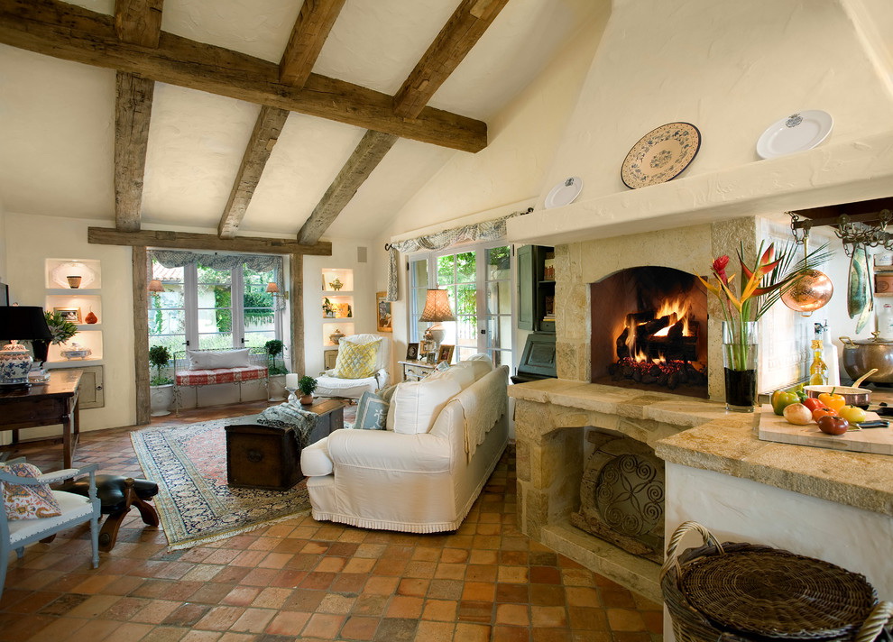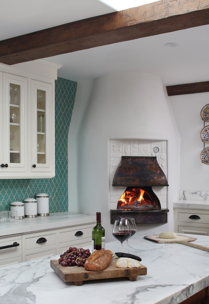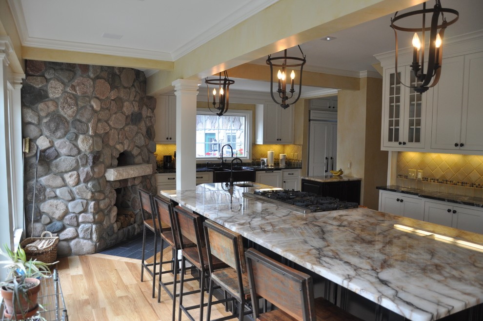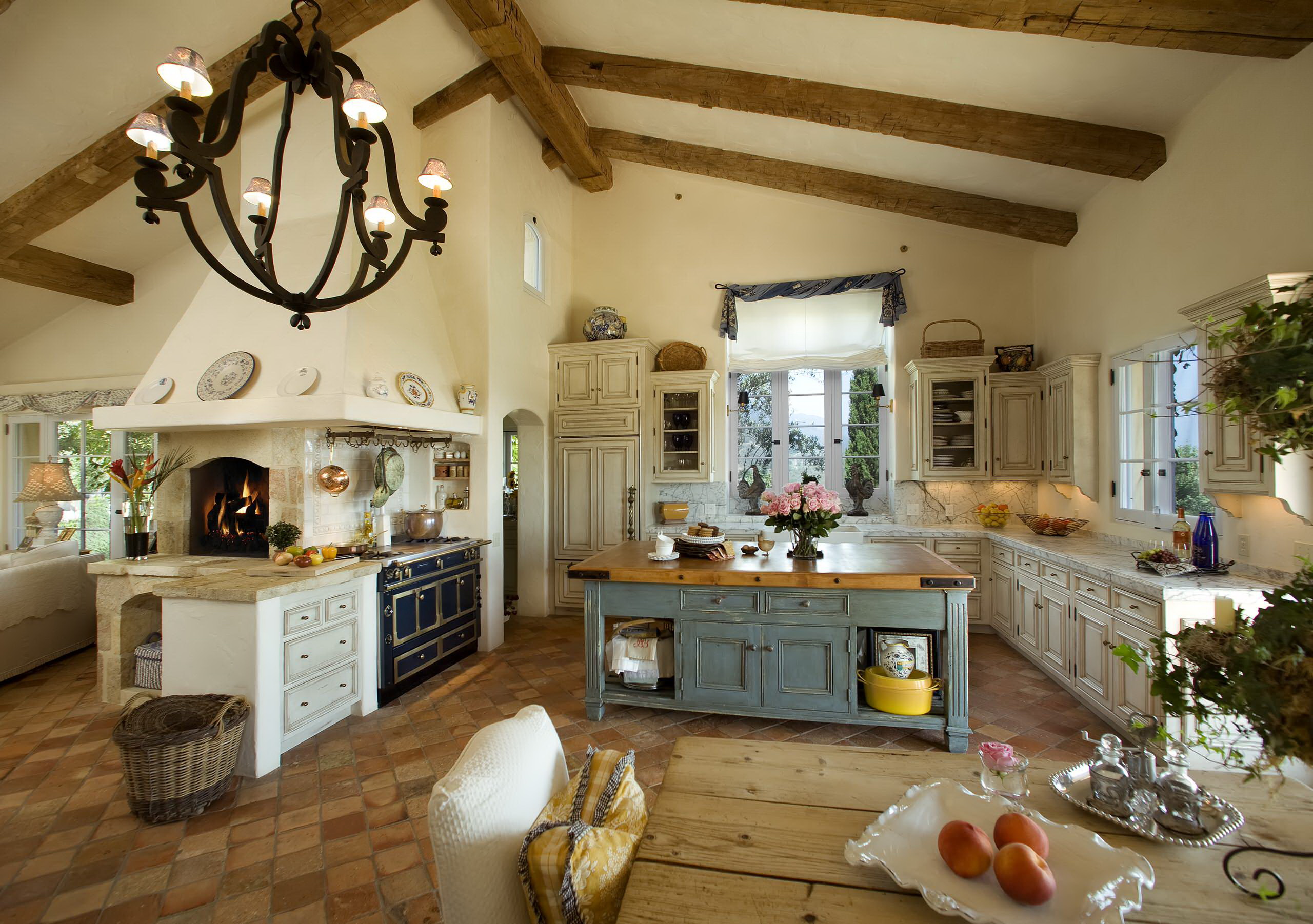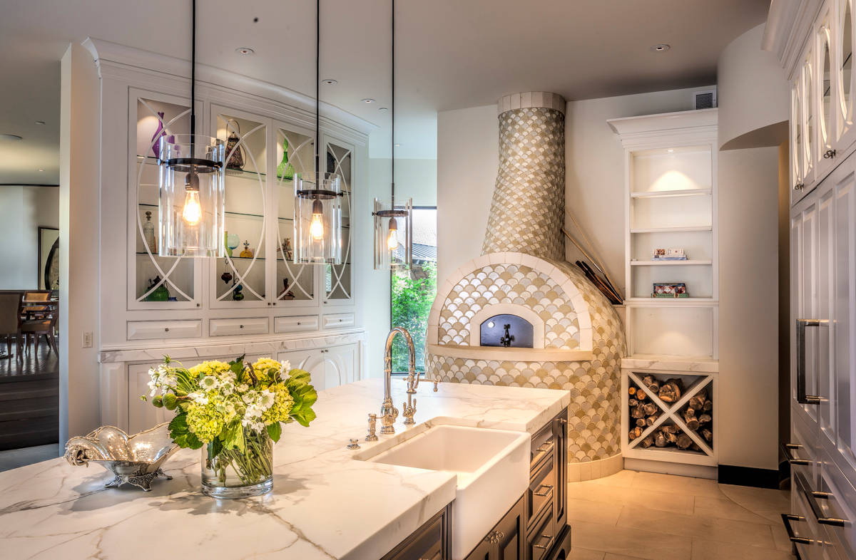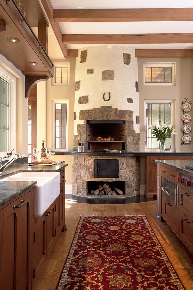 - A parte principal do fogão está na cozinha, e a parte do forno é levada para a sala de estar. A parte do forno pode ser emoldurada em mármore, se o interior da sala de estar corresponder a ou se tornar semelhante a uma lareira. Além disso, você pode instalar conjuntos especiais para a lareira: drovnitsa, besom, knockoff, poker. Nas imediações do mesmo no chão você pode colocar uma bela carpete ou definir suave e aconchegante sofá. No entanto, não se esqueça das regras de segurança contra incêndio. Se a fornalha estiver aberta, você precisará instalar uma tela de proteção ou vidro.