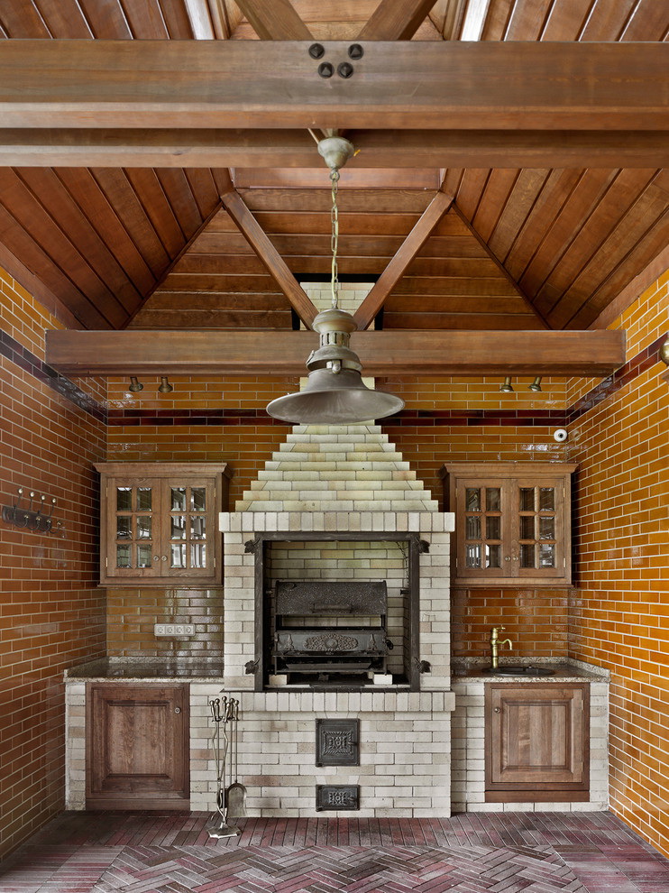 Brick é um clássico. Anteriormente, tais estruturas foram erguidas de tijolos de barro caseiros, que foram assados no fogo. Os produtos são grandes devido à presença da placa, compartimento de cozimento, espreguiçadeira para descanso.