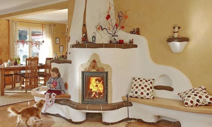 - com uma lareira. Esta opção é uma nova tendência. Sua peculiaridade é que a parede traseira da construção da fornalha é levada para outra sala através da parede. Assim, em um projeto dois são combinados: uma lareira com efeito de chama e todos os sons magníficos de lenha crepitante, bem como um fogão russo clássico que aquece a casa, tem uma fornalha para cozinhar e um fogão para cozinhar;