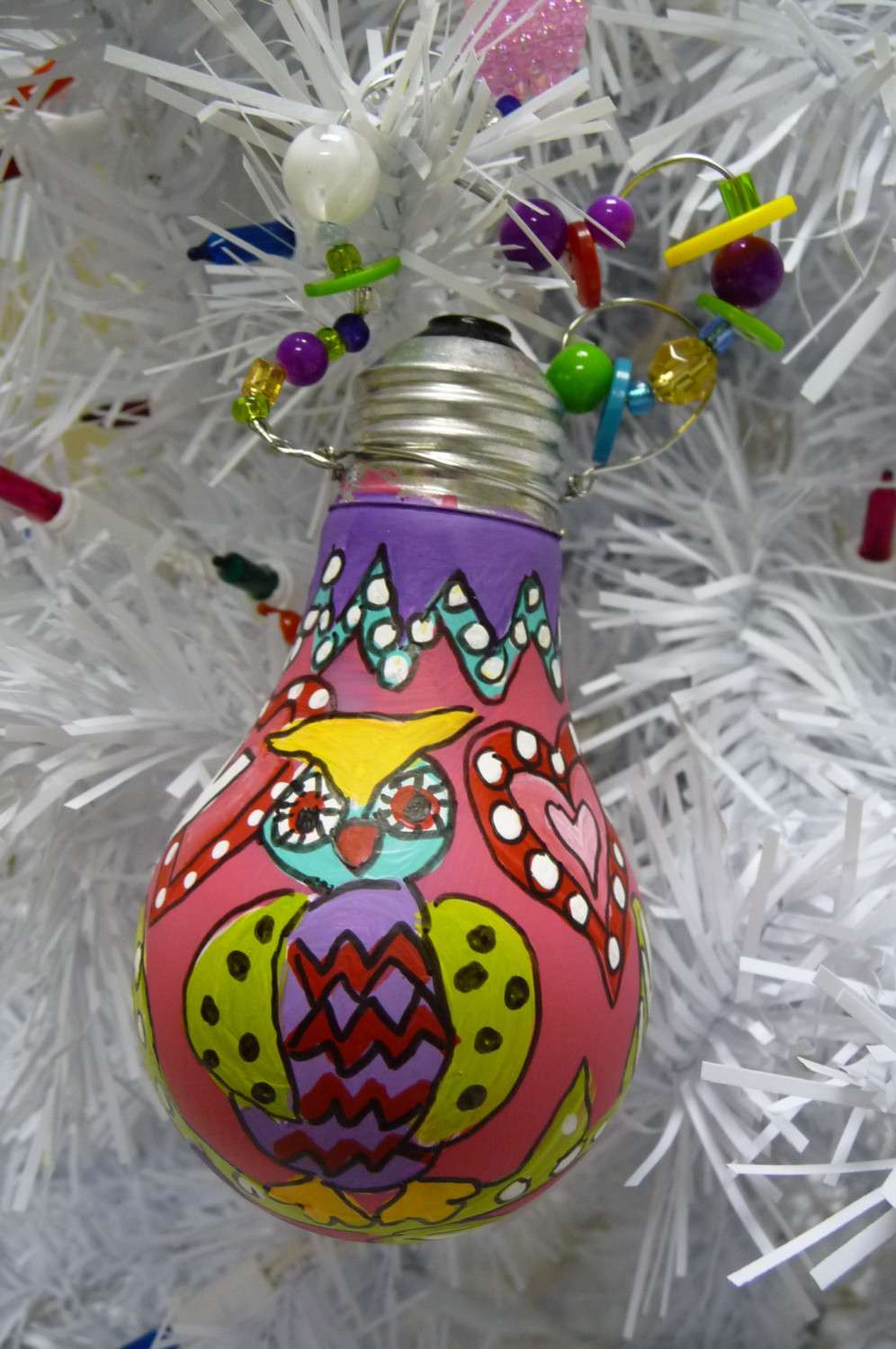 - Se houver fitas, miçangas, fios multicoloridos, então você pode usá-los como materiais para decoração. Para fazer isso, pinte a lâmpada com cola e coloque cuidadosamente o desenho no topo. Contas ou contas em cima, é desejável fixar o verniz.