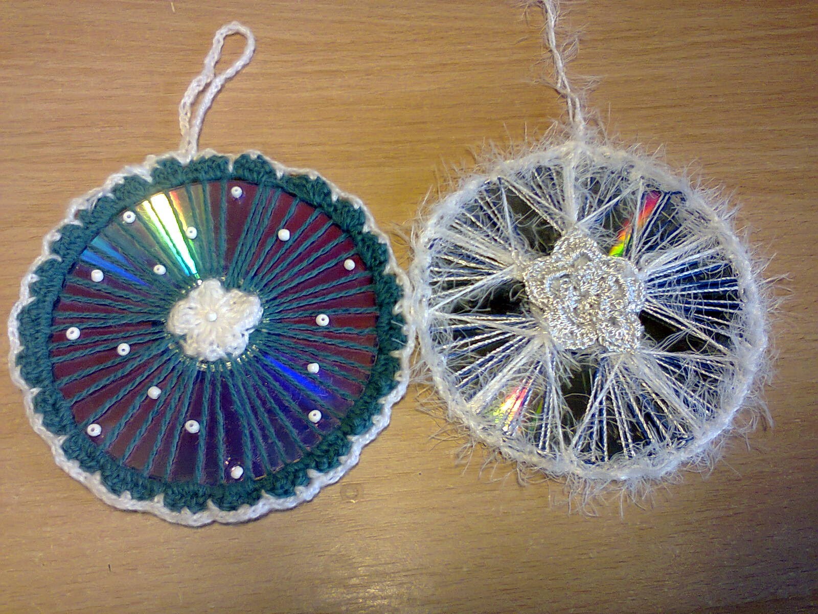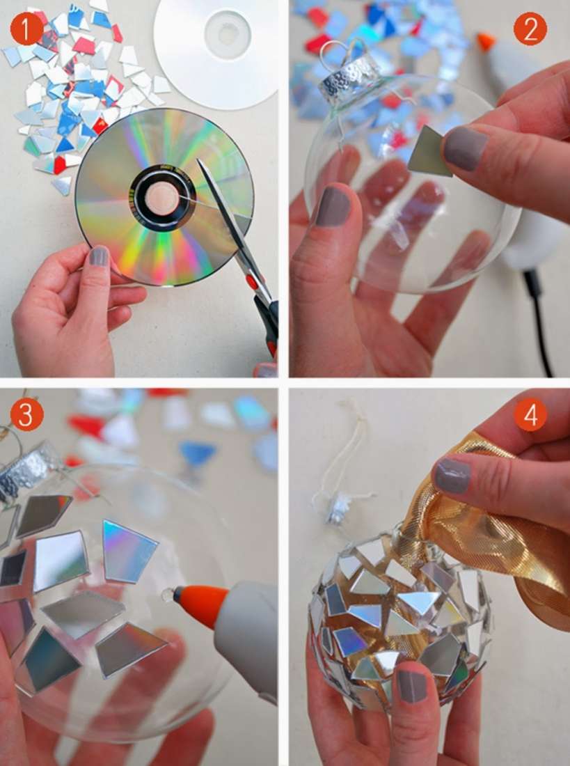 Além disso, os discos podem ser cortados em pequenos pedaços. Para fazer isso, é melhor usar uma tesoura forte, criando fragmentos de tamanhos diferentes. Então, usando cola, eles são presos a uma bola de silicone transparente que está vazia no interior. Você pode tentar colá-los em brinquedos sólidos, por exemplo, nos vermelhos. O resultado é um mosaico original, que será maravilhosamente brilhante com iluminação festiva.