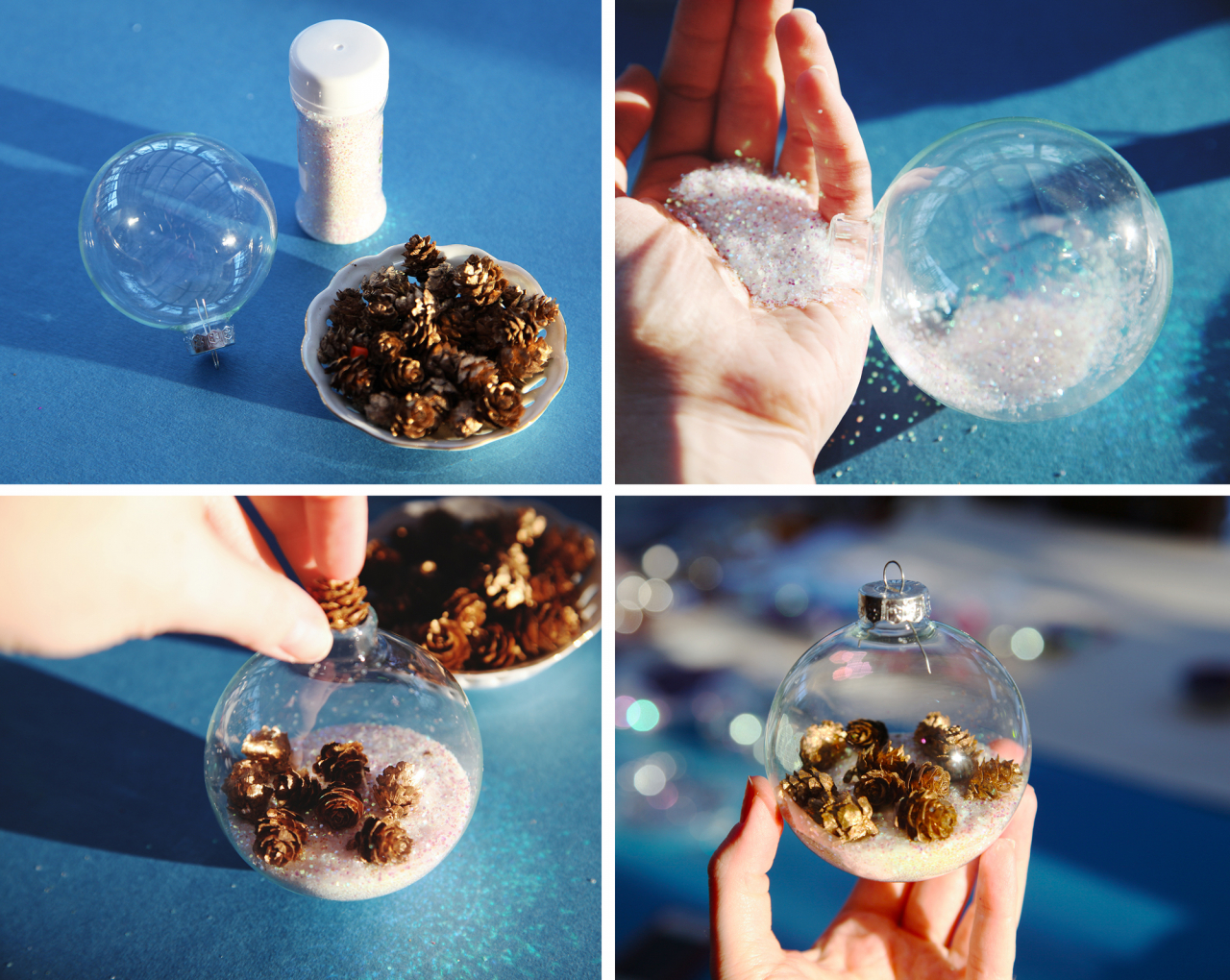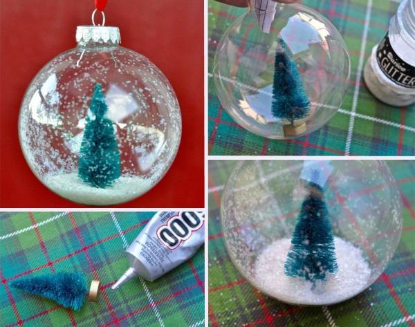 Nas lojas você encontra bolas transparentes de Natal - uma espécie de chupeta, projetada para enchê-las com diferentes materiais. Como regra geral, eles são de silicone, para facilitar. Você pode usar essas ideias: