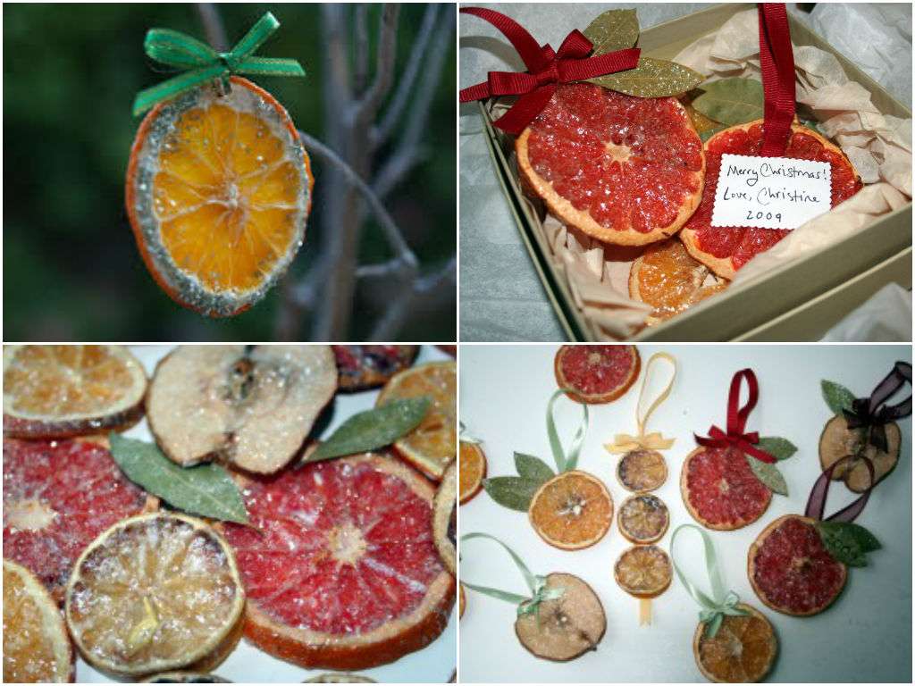 - Citrus. Laranja, limão e grapefruit adequados. Tudo que você precisa fazer é cortar um círculo, é aconselhável usar o meio da fruta, lá será o maior, enfie-o em uma corda e pendure-o. É claro que um “brinquedo” logo murchará, portanto, isso deve ser feito antes da chegada dos convidados.