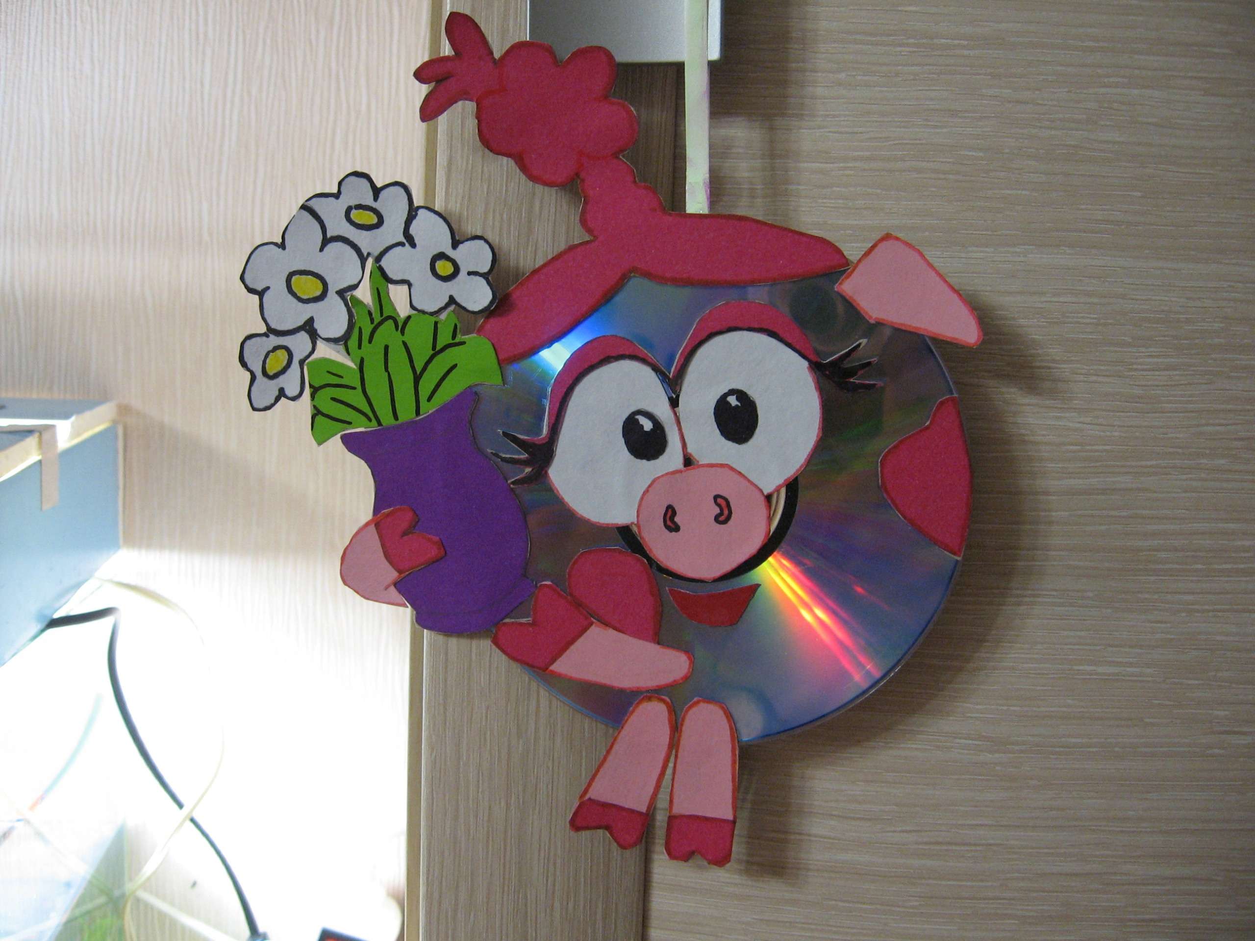 De discos você pode fazer uma obra de arte, mas esta opção é adequada principalmente para quem pode desenhar. Com a ajuda de uma paleta de cores, você pode desenhar diretamente no disco.De cima, essa criatividade é coberta com verniz, e é muito simples fixá-la a um galho - basta apenas passar o fio pelo buraco, que está no meio.
