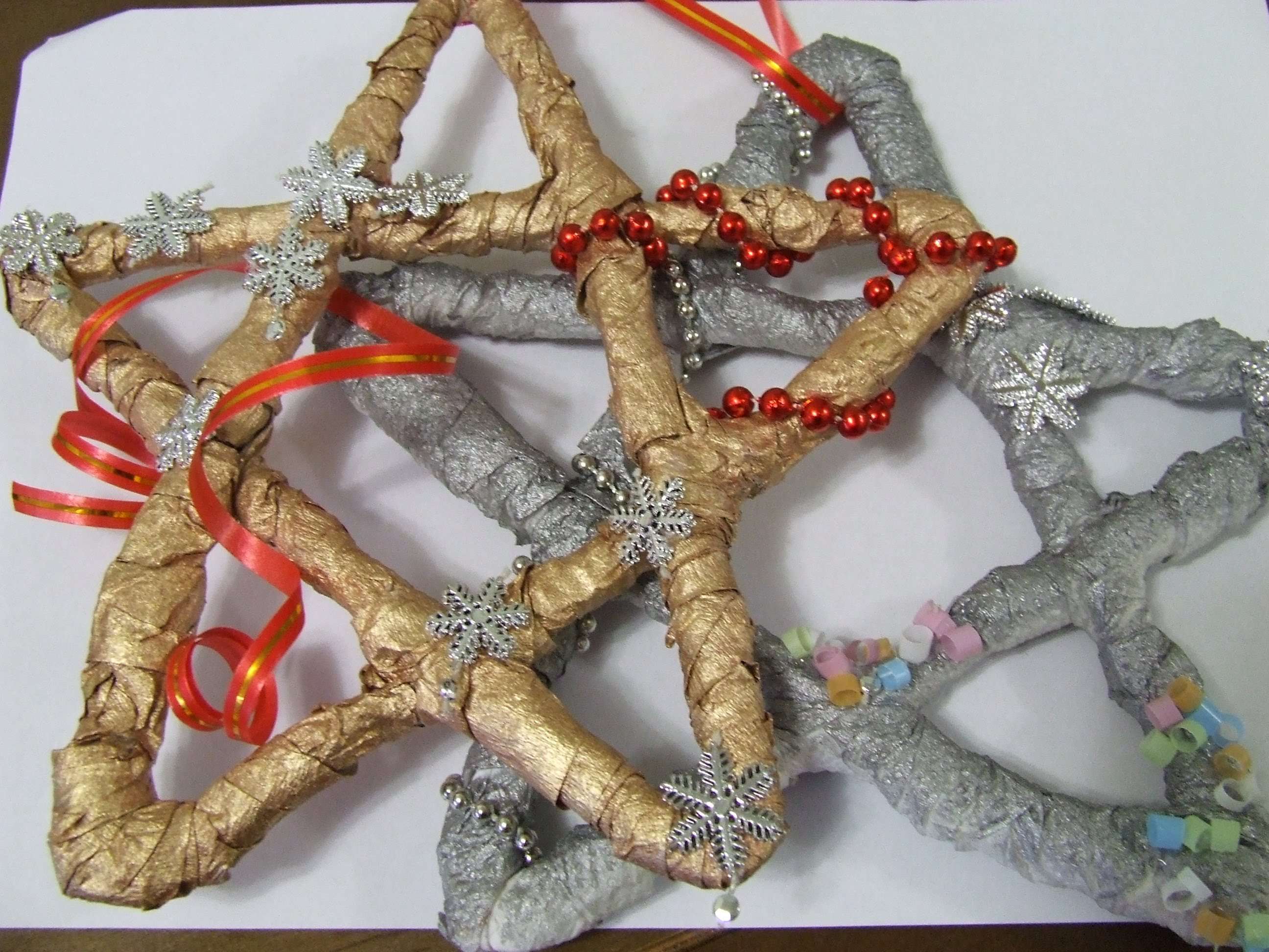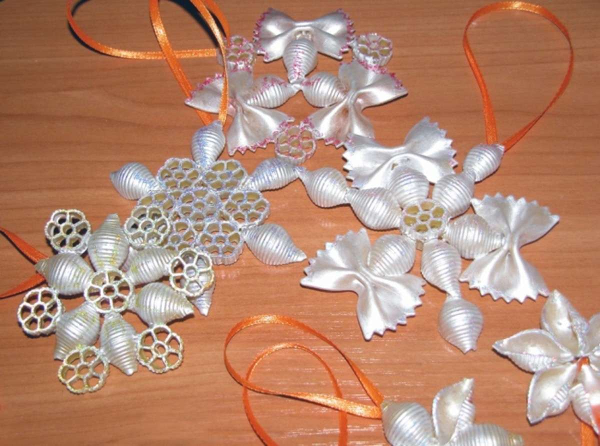 - Macarrão. Com a ajuda de massa encaracolada, você pode fazer figuras diferentes. Por exemplo, variedades na forma de arcos podem ser amarradas em um arame e fazer tais contas. E o macarrão na forma de rodas pode ser colado repetindo a forma de um floco de neve. Nos supermercados você pode encontrar itens coloridos que também parecerão originais.