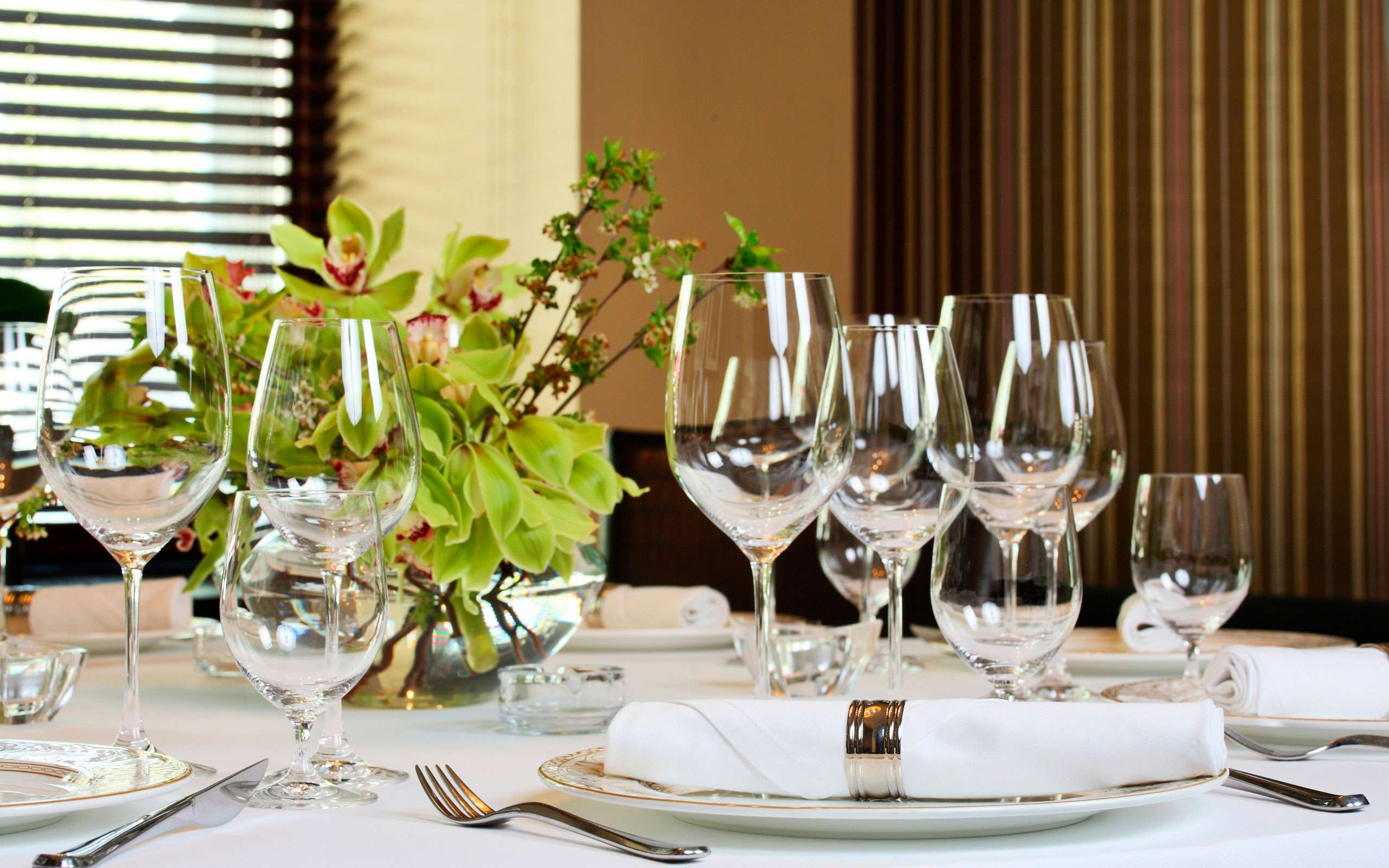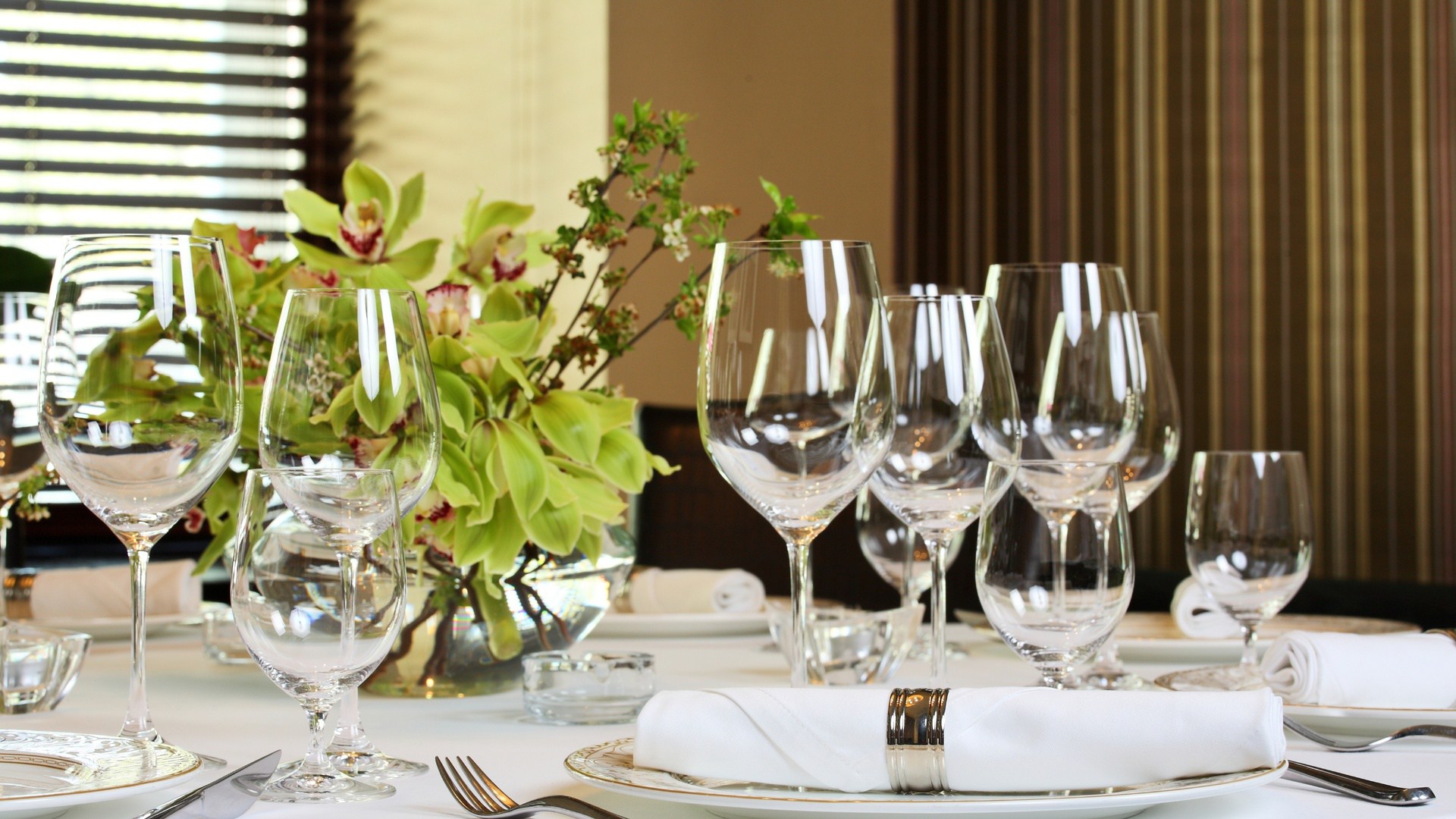 Lindos copos sempre parecem luxuosos e dão um ambiente especial para o jantar. O vidro principal, que deve necessariamente estar presente, é aquele que é projetado para água. É colocado acima das facas, a uma distância de cerca de 7 cm acima.