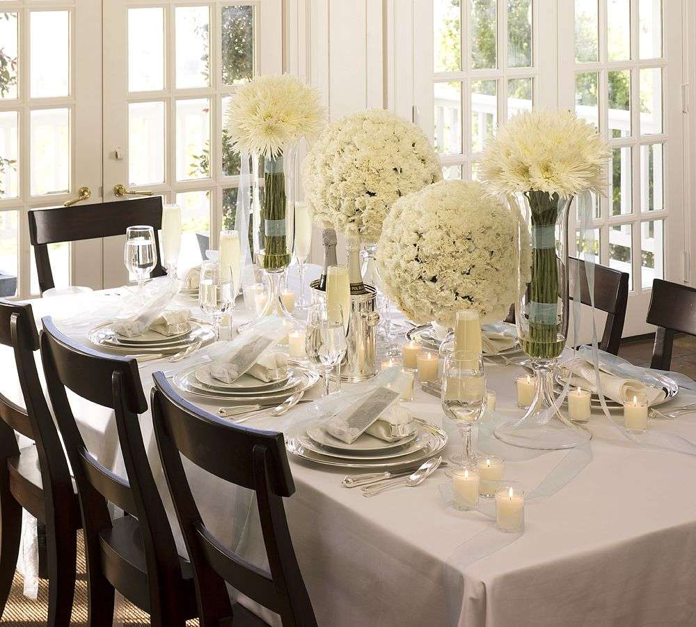 A maneira mais simples, mas ao mesmo tempo, de decorar um jantar é colocar um punhado de flores no centro. Não deve ser um buquê enorme, porque nada deve distrair a atenção dos pratos, e os convidados devem se ver bem. Portanto, é melhor usar a composição de um tamanho pequeno, que parece elegante e esteticamente agradável, e também se encaixa no design geral, especialmente na cor.