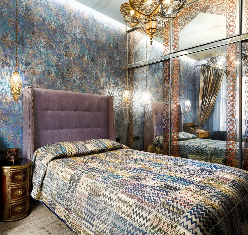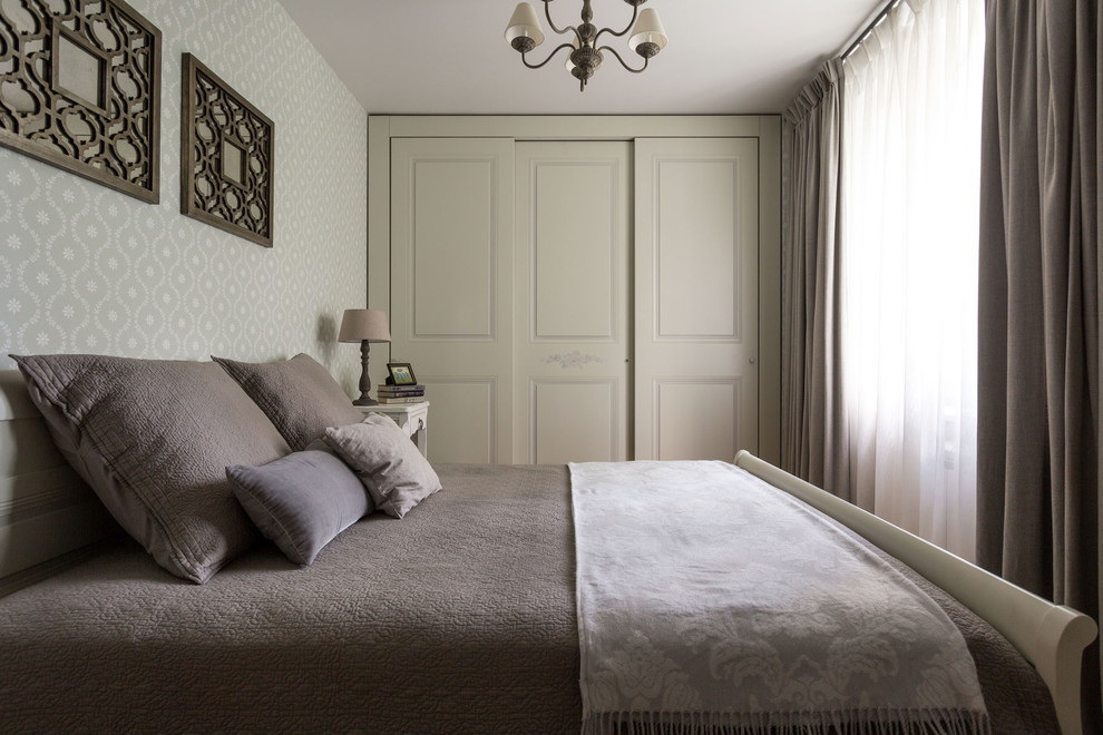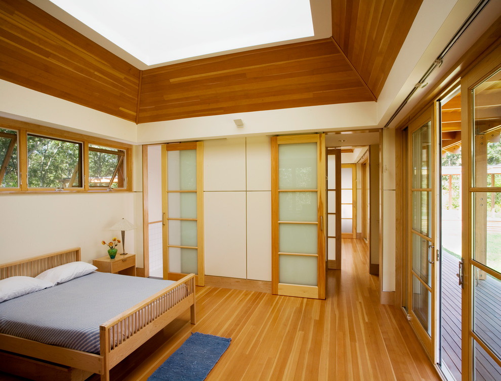 Padrões orientais nas fachadas - uma solução comum. Mas para que no interior tal guarda-roupa não pareça alienígena, o resto do mobiliário também deve ser projetado no tema da China ou do Japão. Qual guarda-roupa será o mais conciso? Aquele que é feito para o quarto em um estilo minimalista.