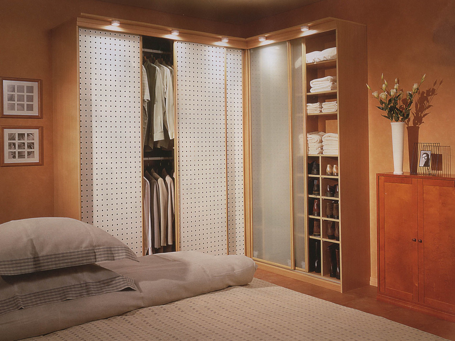 Mesmo em um pequeno quarto você pode encontrar um lugar para um guarda-roupa embutido. Isto é conseguido selecionando o modelo da configuração desejada.