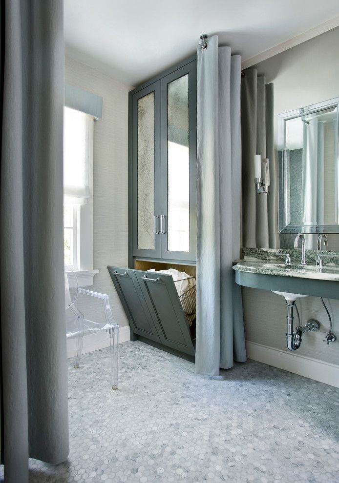 O mobiliário multifuncional é prático - por exemplo, um modelo com um cesto extraível pode ser colocado na casa de banho para guardar roupa de cama e acessórios de banho.
